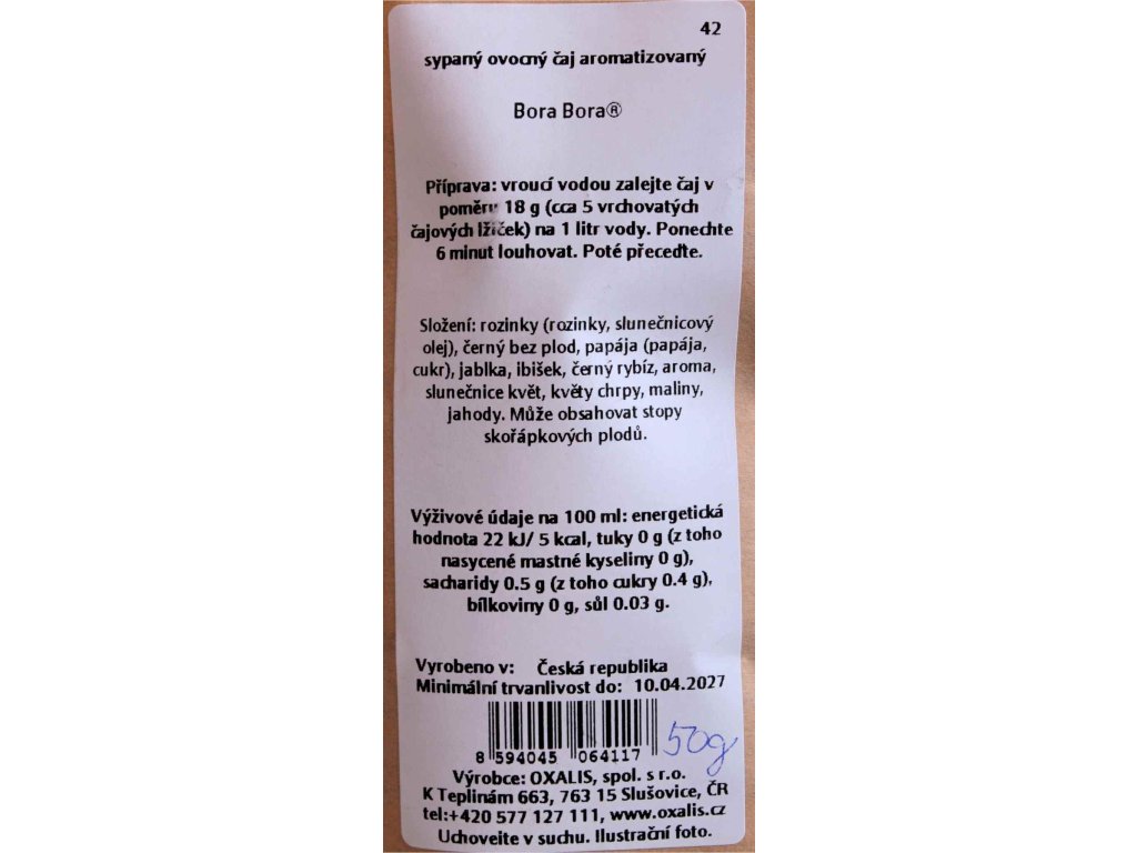 Sypaný ovocný čaj, aromatizovaný. Složení je uvedeno na štítku ve fotogalerii (směs sušeného ovoce, ibišek aj.).