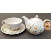 Porcelánová čajová sada je ručně malovaná. Skládá se z konvičky a šálku. Konvička má obsah cca 450ml a šálek cca 200 ml. Vše se dá používat a mýt běžným způsobem. Nedoporučujeme mytí v myčce na nádobí. Krásný a praktický dárek.