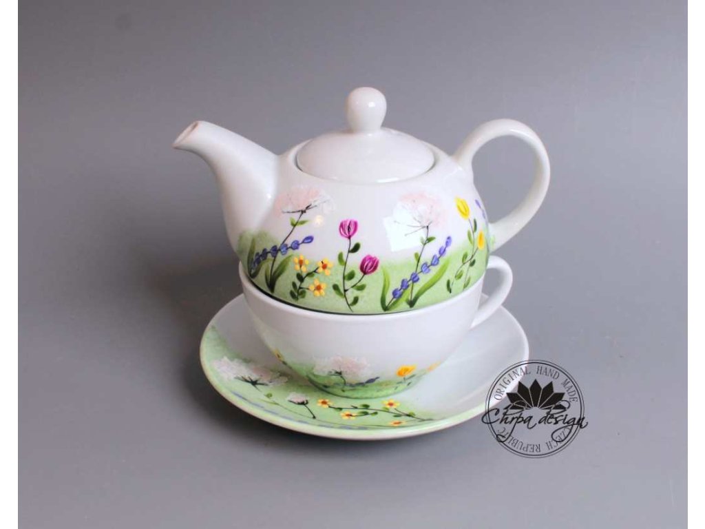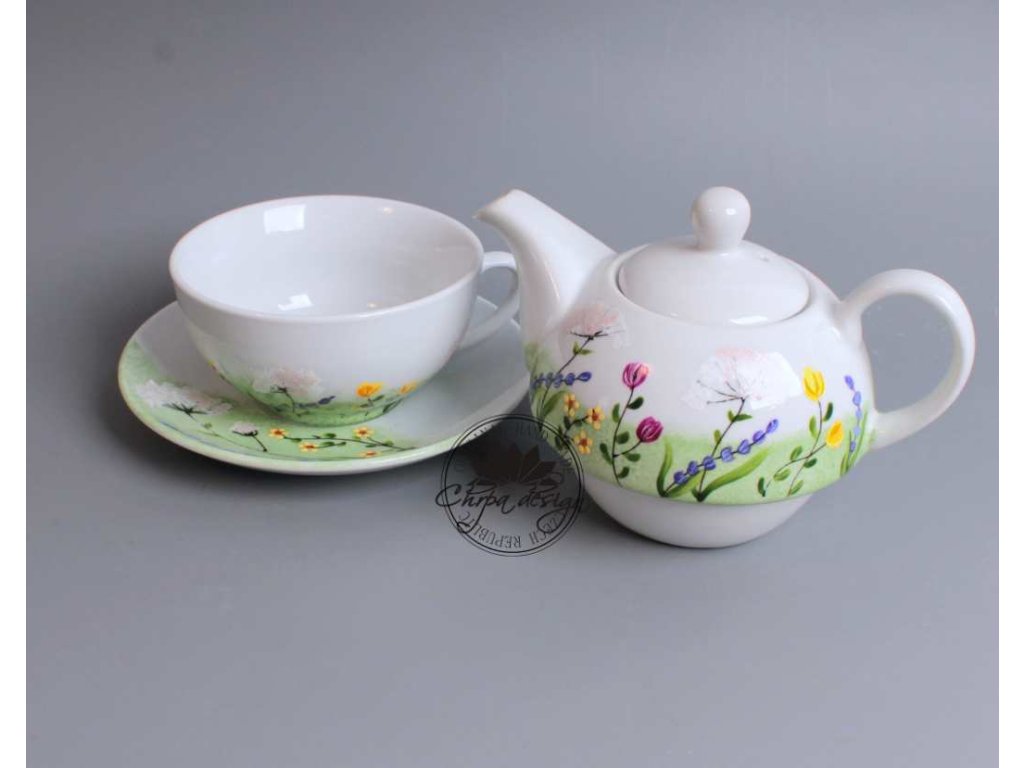 Tato čajová sada je vyrobena z porcelánu a ručně malovaná. Konvice má obsah 0,5 L a šálek má obsah 0,3 L. Sada je doplněná podšálkem. Dá se běžně používat a umývat běžným způsobem. Nedoporučujeme umývat v myčce na nádobí.