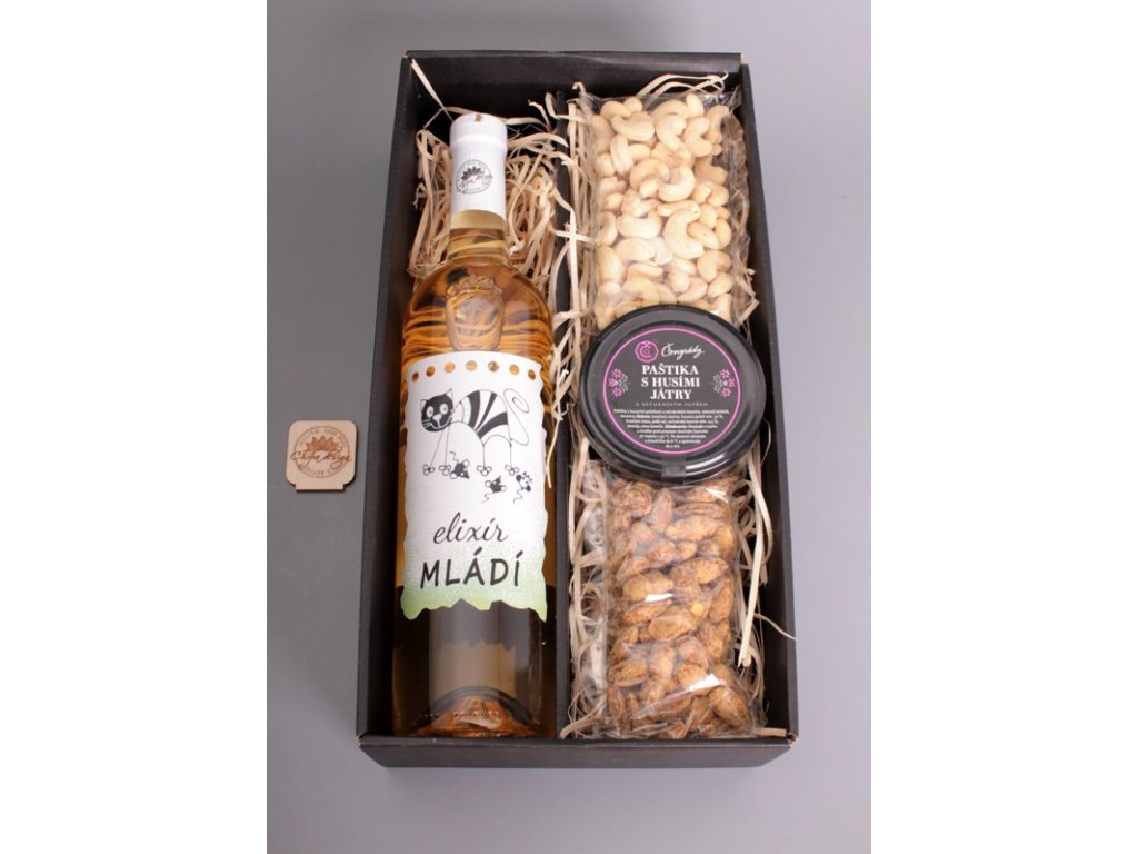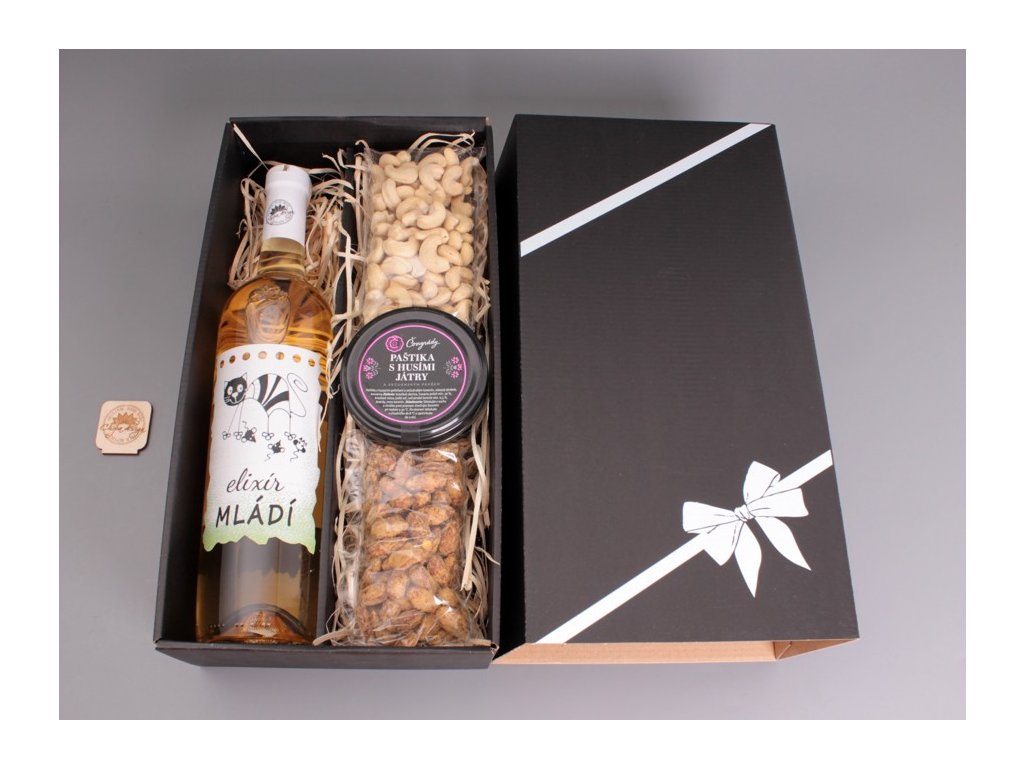 Náplň balíčku: Rulandské šedé 0,75l (polosuché víno), kešu celé natural 100g, mandle pražené s hořčicí 100g, paštika s husími játry a sečuánským pepřem 170g, dárková krabice.