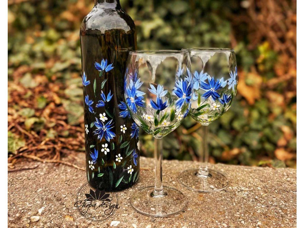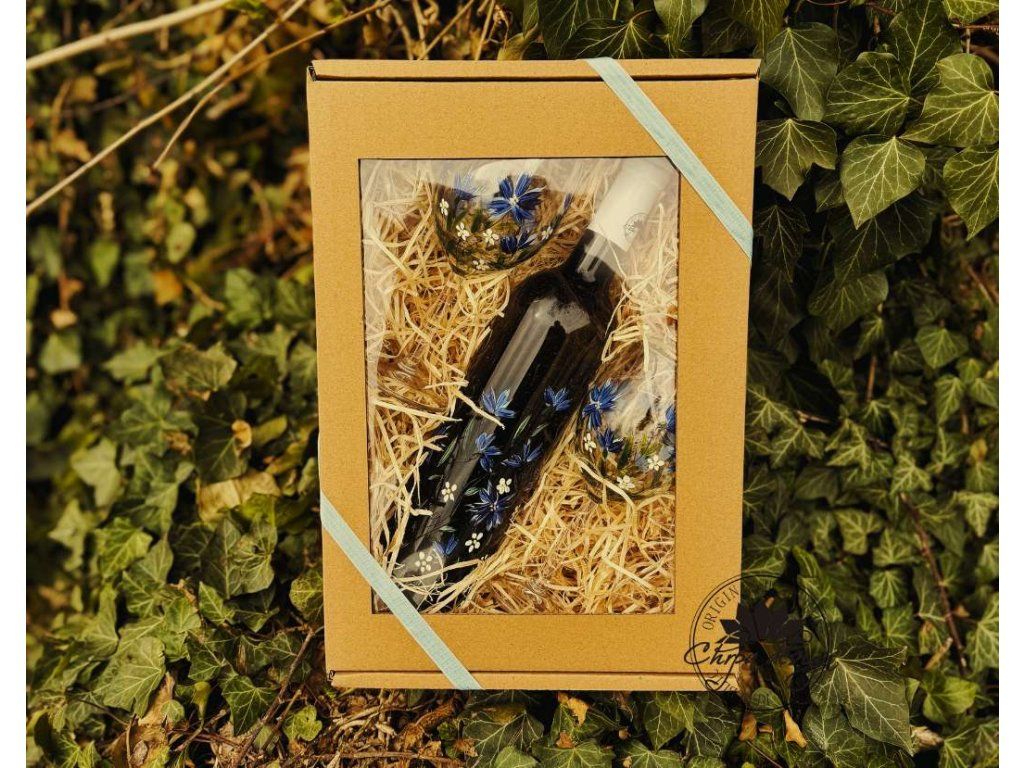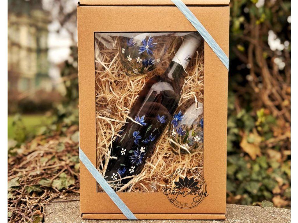 Dárkový balíček - malované víno + 2 skleničky, Chrpy