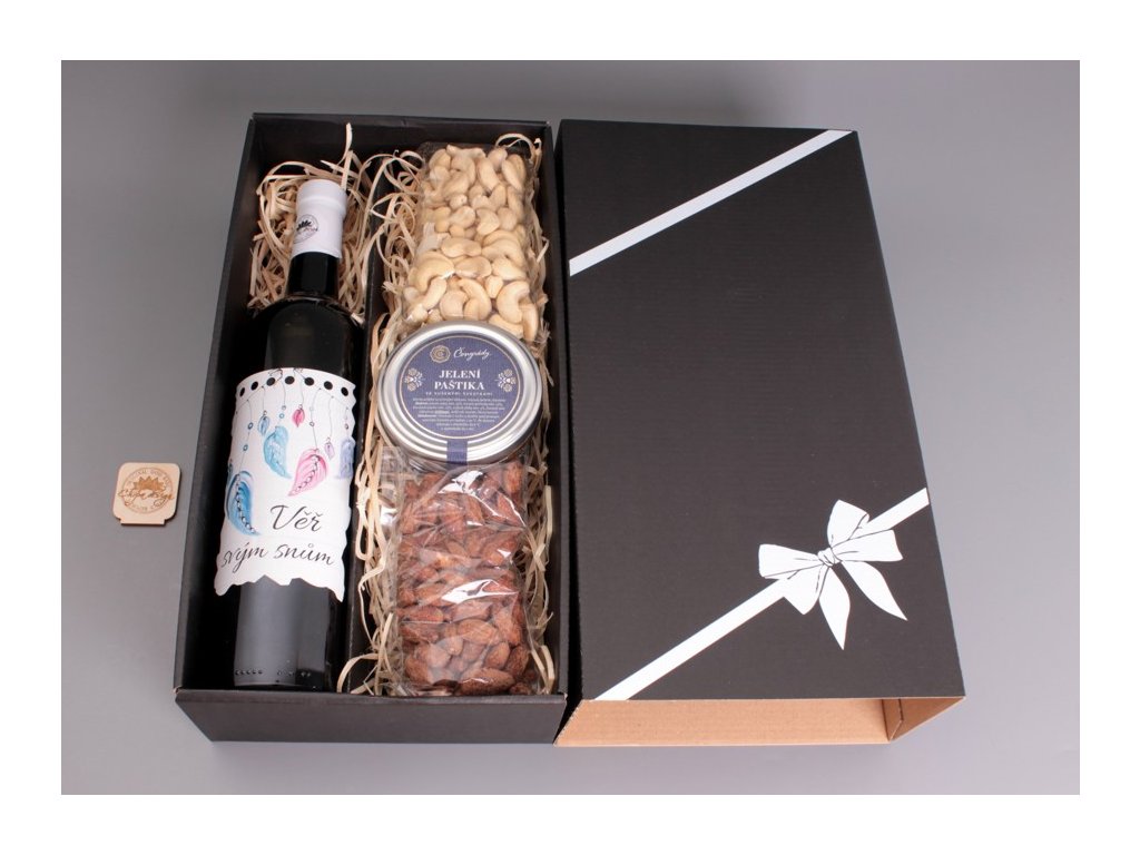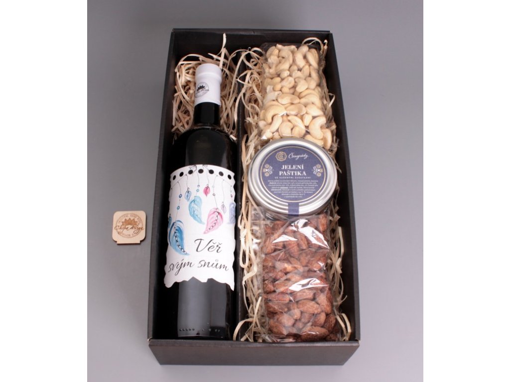 Náplň balíčku: víno Cabernet Moravia 0,75l (suché víno), kešu celé natural 100g, mandle uzené 100g, jelení paštika se sušenými švestkami 170g, dárková krabice.
