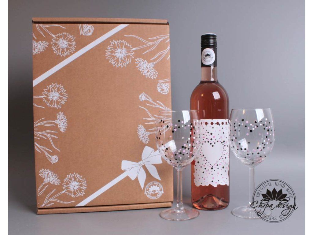 Dárkový balíček s vínem a dvě vínové sklenice ve stejném designu.