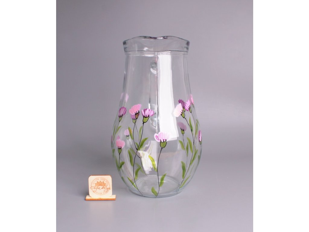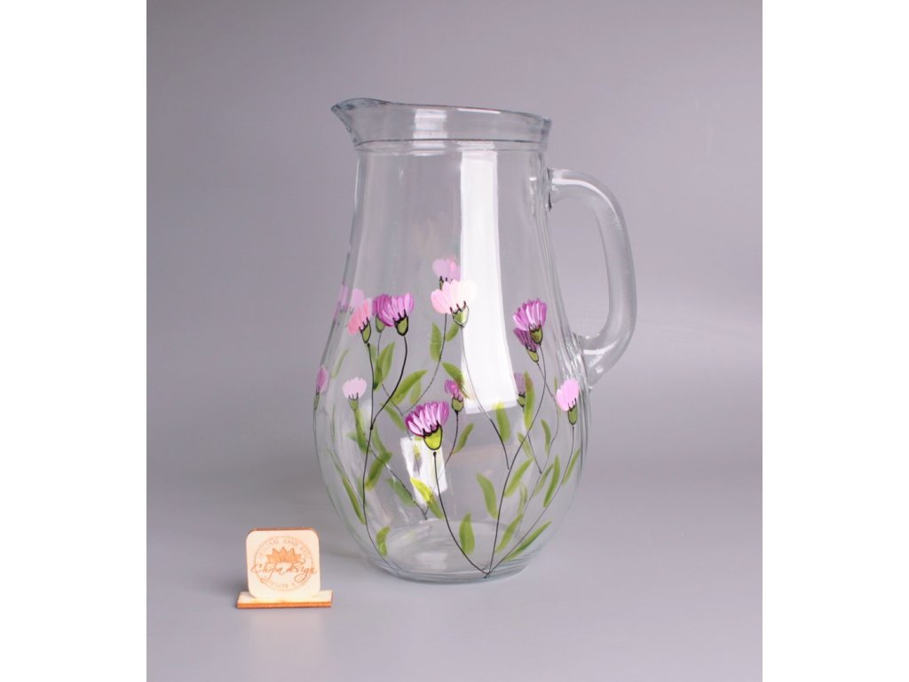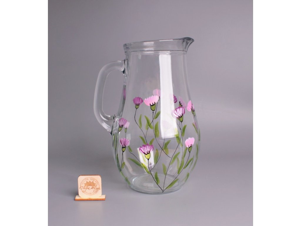 Skleněný džbán je ručně malovaný. Vhodný především na studené nápoje. Lze doplnit také ručně malovanými sklenicemi ve stejném vzoru. Dá se běžně používat a mýt běžným způsobem. Nevhodné do myčky na nádobí. Obsah džbánu je 1,8 L