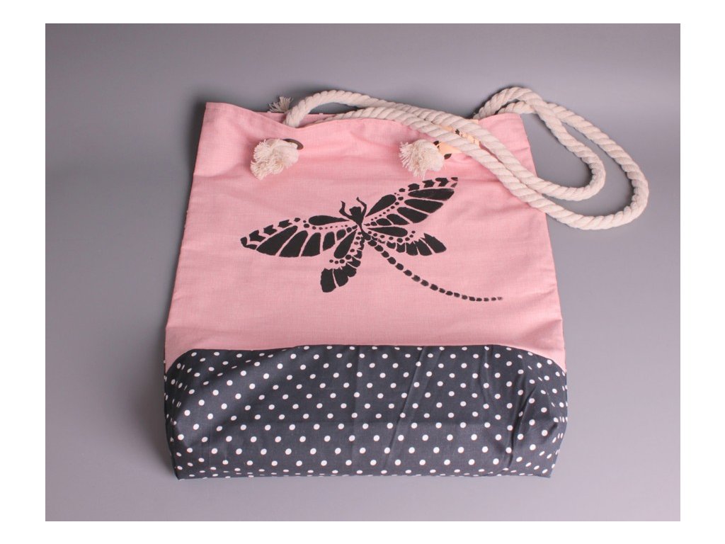 Kabelka (taška) je vyrobena z látky 100% bavlna. Ucho je z jemného lana. Uvnitř kabelky jsou všité kapsy na drobnosti. Z jedné strany je kabelka ručně malovaná a z druhé strany je látka s potiskem. Kabelka je z dvojité látky (podšívka). Rozměr kabelky je 38 cm šířka a 45 cm výška.