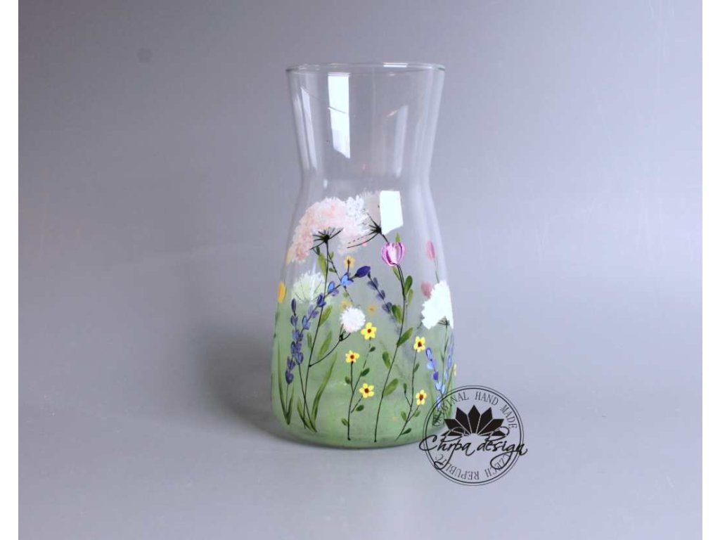 Karafa má obsah 1 litr. Výška karafy je 20cm. Je ručně malovaná a dá se použít jako karafa na vodu spolu se stejně malovanými longovkami. Můžete také použít jako vázu. Krásný designový doplněk. Nedoporučujeme  mytí v myčce na nádobí.