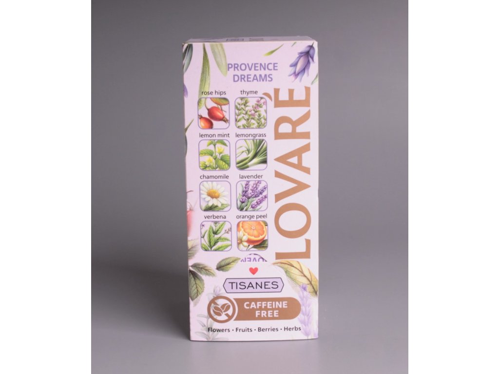 Lovaré Provence Dreams je harmonická bylinná směs s šípkem, citrónovou trávou, mátou citronovou a nádechem levandule, tymiánu a pomerančové kůry. Přenese vás do klidného prostředí provensálských zahrad.