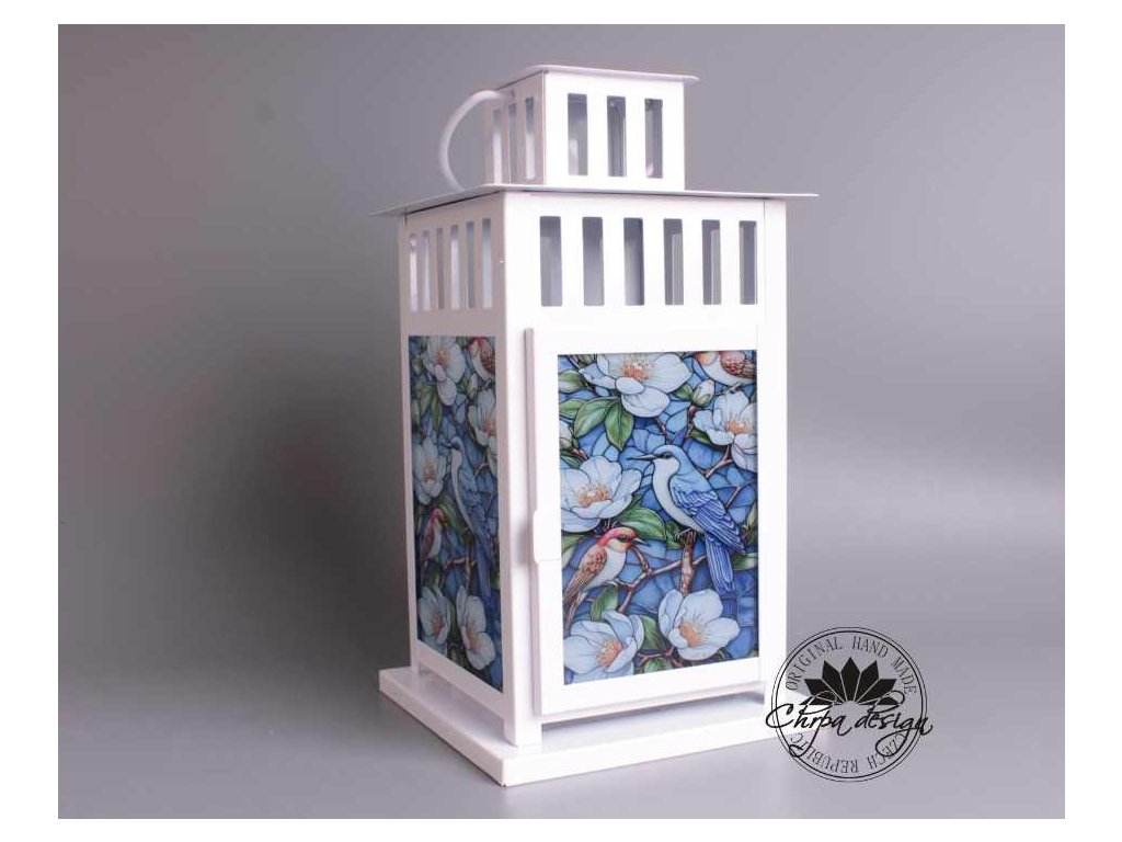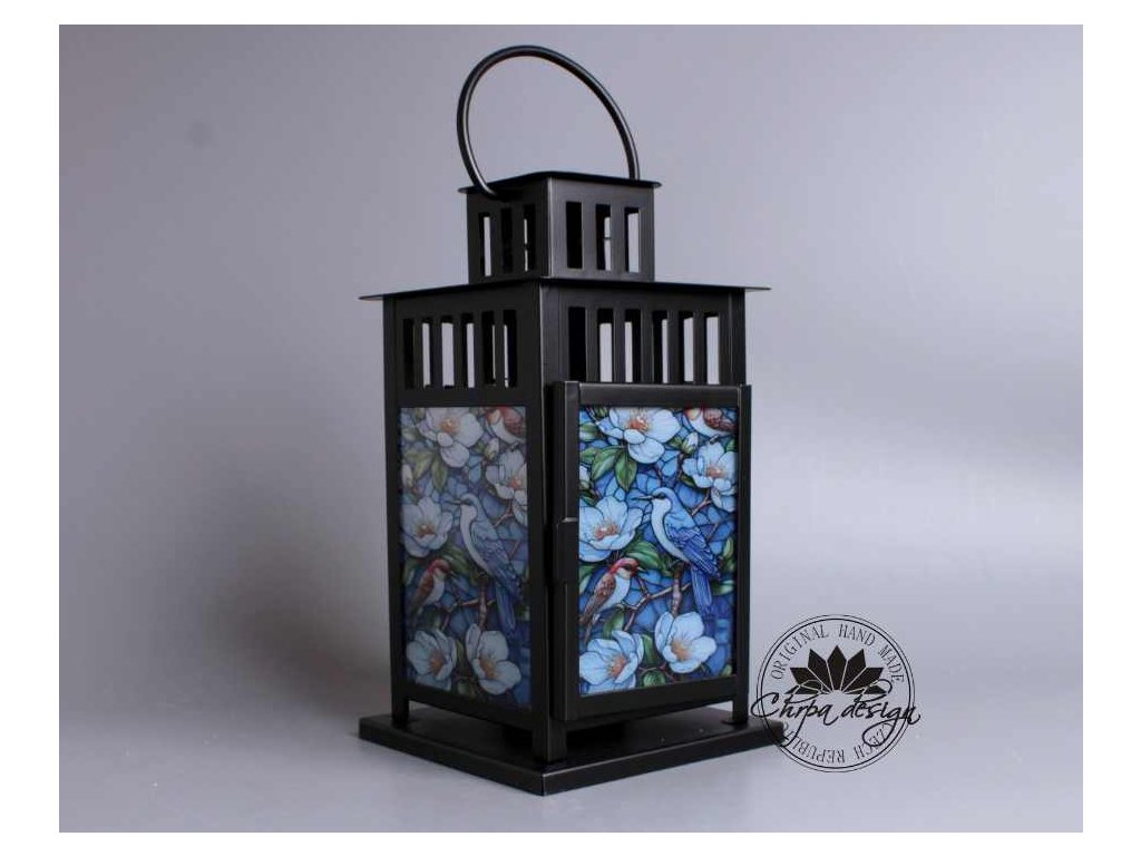 Okouzlující hra světla s barvami našeho designového potisku a la vitráž v lucerničce.