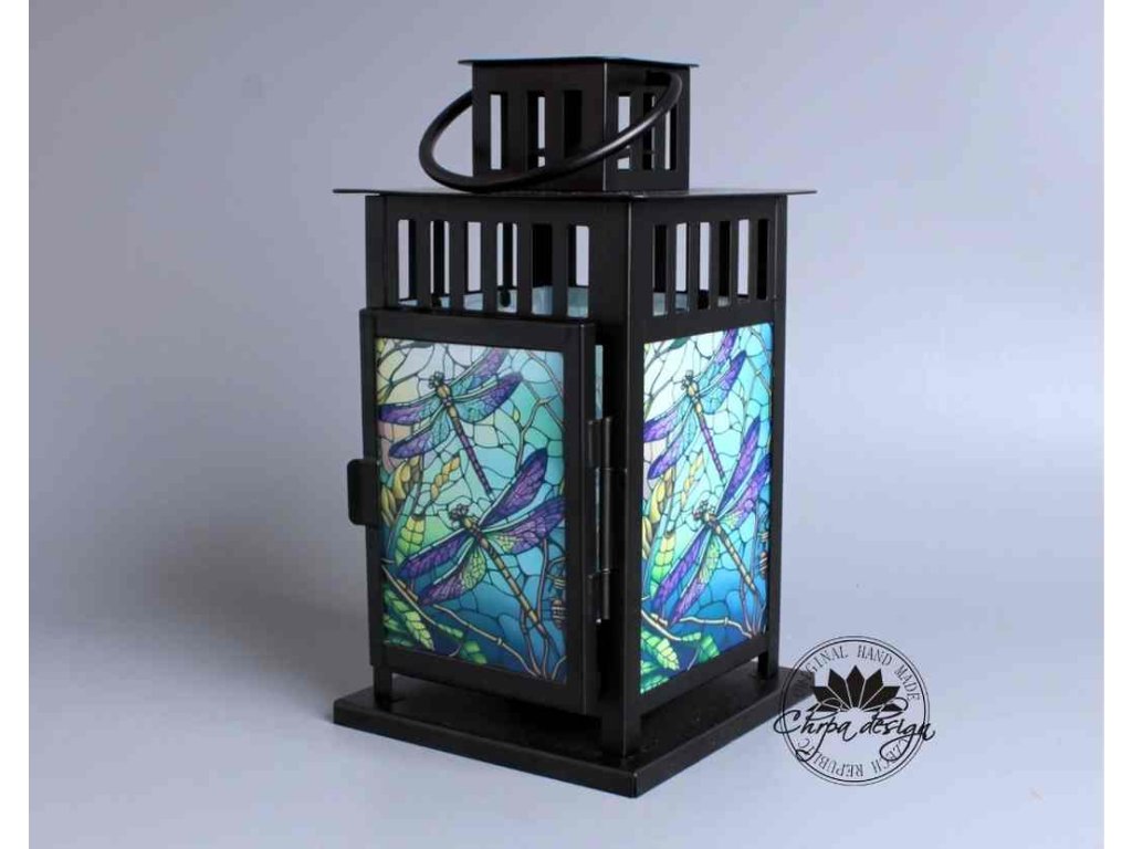 Okouzlující hra světla s barvami našeho designového potisku a la vitráž, v malé lucerničce.
