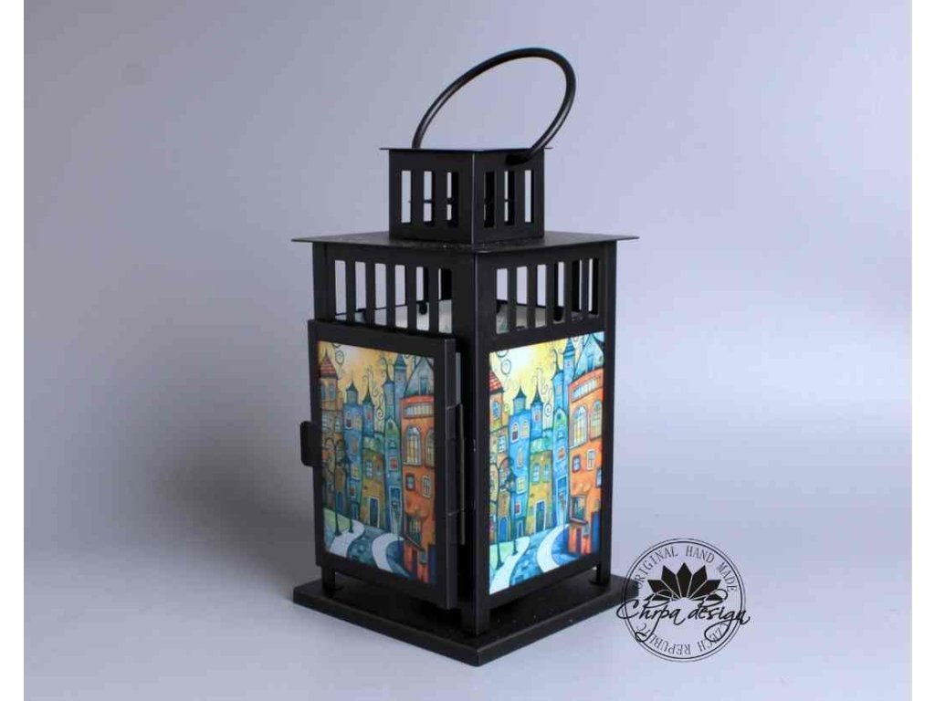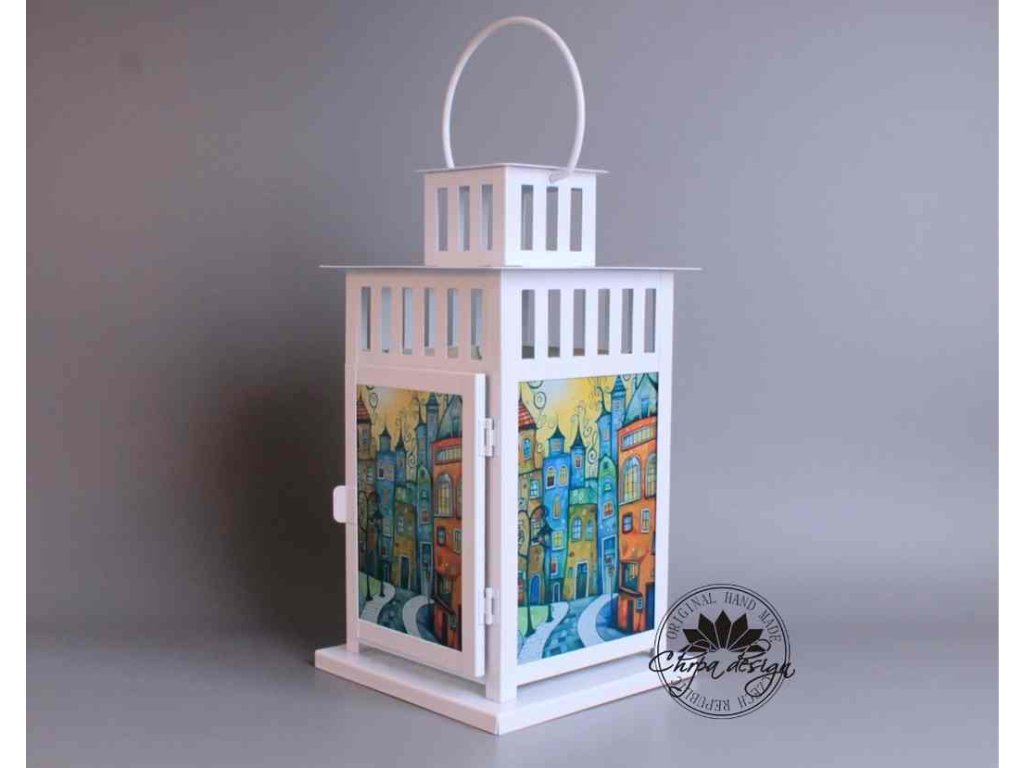 Okouzlující hra světla s barvami našeho designového potisku a la vitráž v lucerničce.