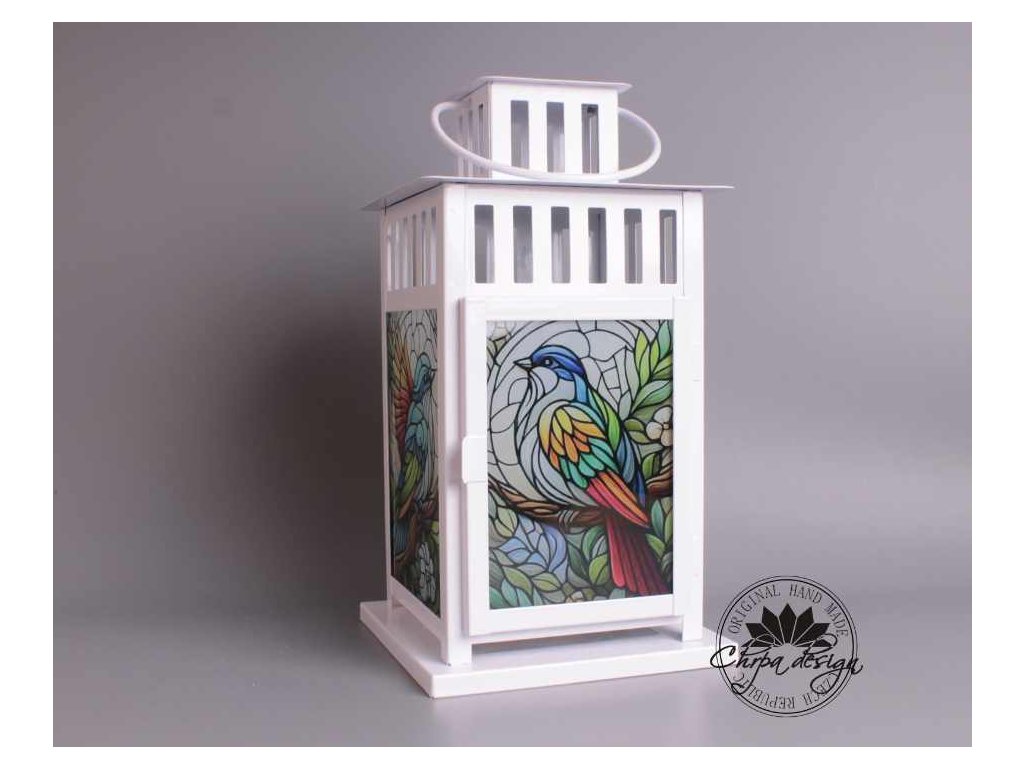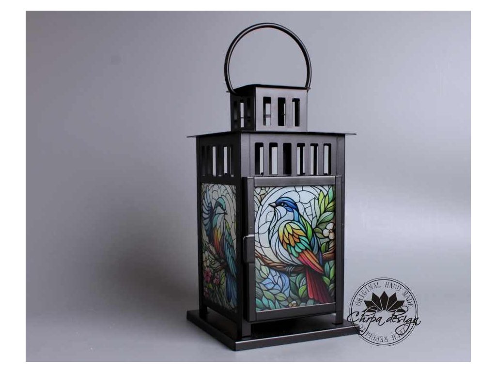 Okouzlující hra světla s barvami našeho designového potisku a la vitráž v lucerničce.