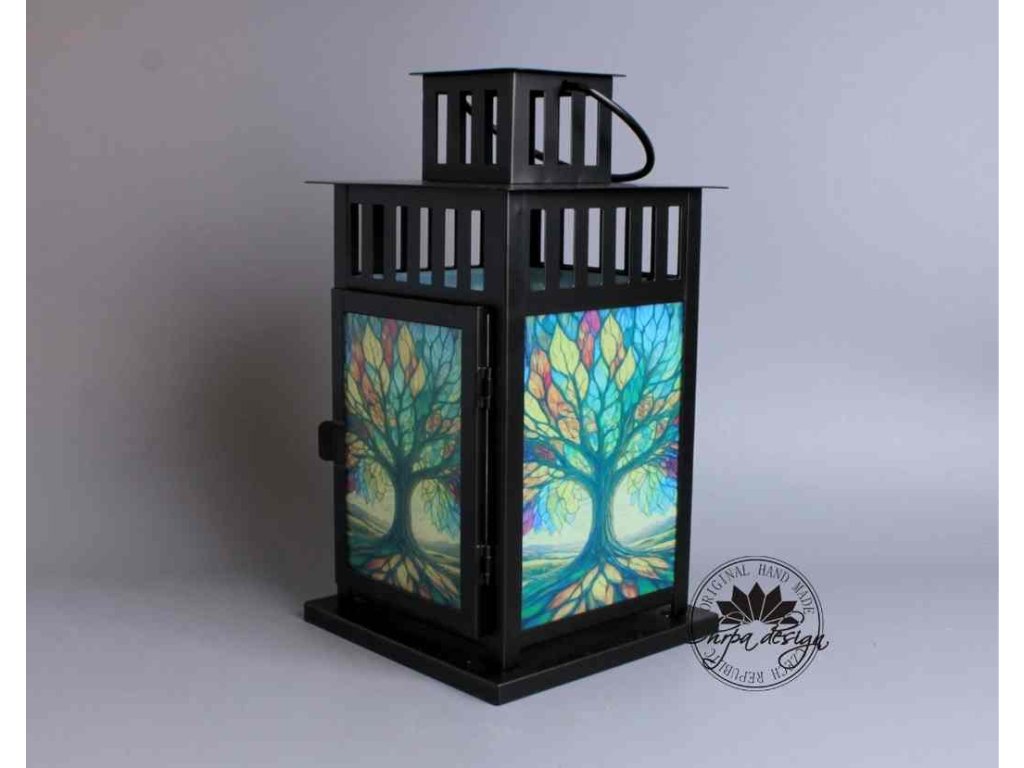 Okouzlující hra světla s barvami našeho designového potisku a la vitráž v lucerničce.