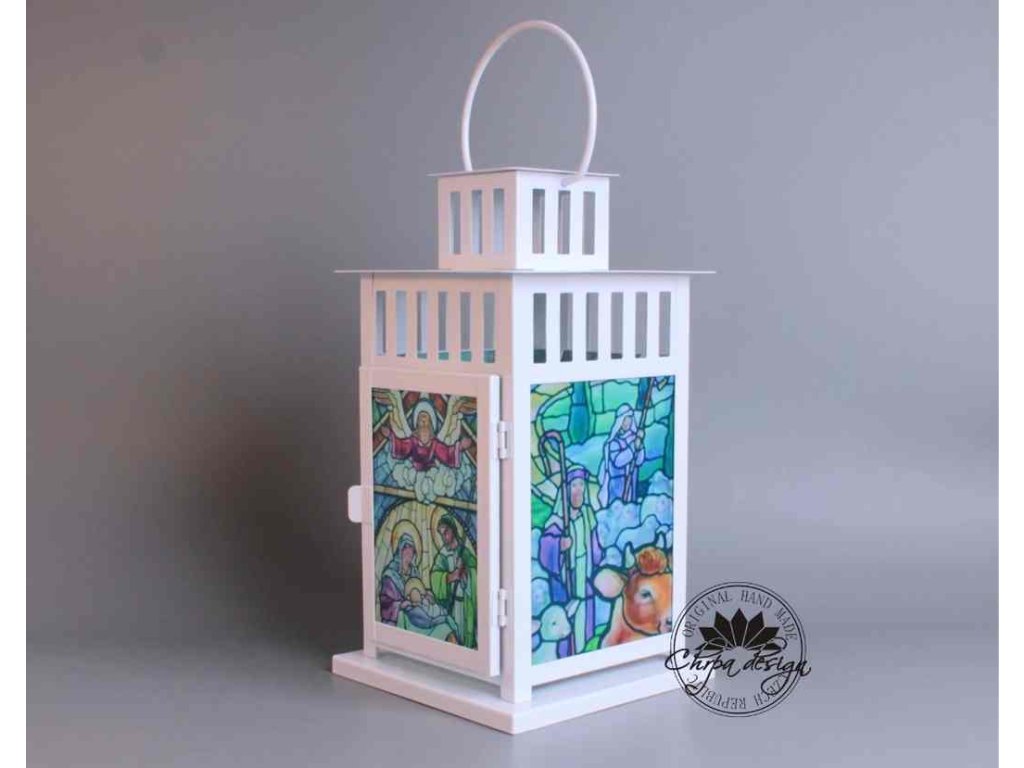 Okouzlující hra světla s barvami našeho designového potisku a la vitráž, v malé lucerničce.