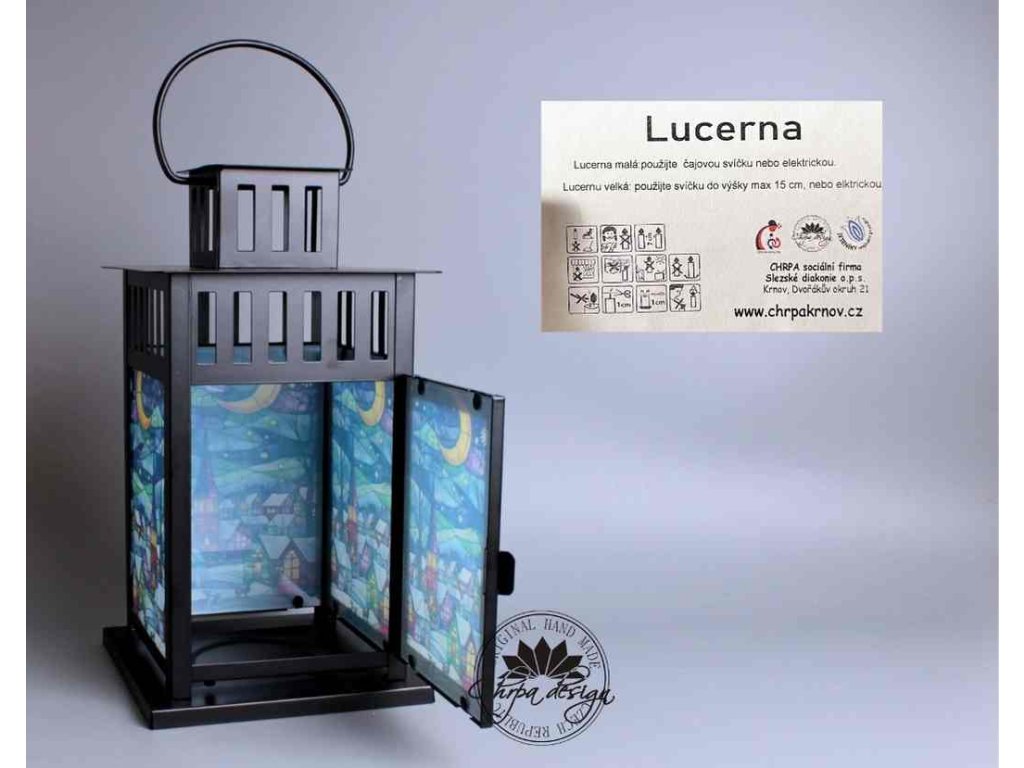 Okouzlující hra světla s barvami našeho designového potisku a la vitráž, v malé lucerničce.