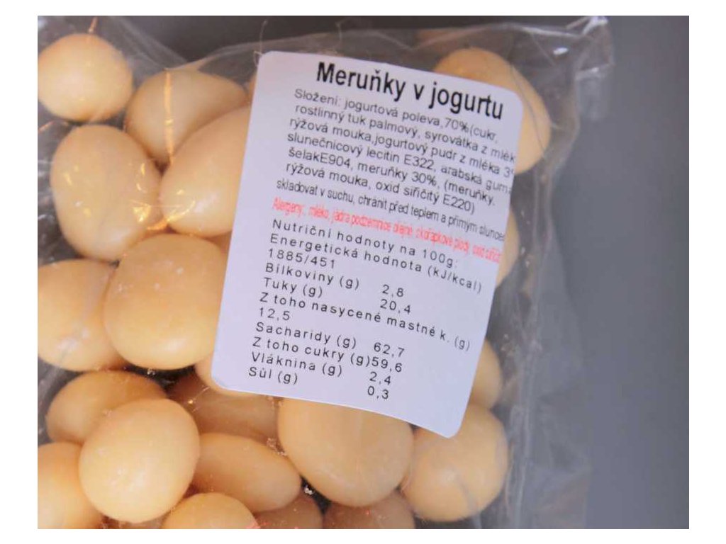 Složení: jogurtová poleva 70% (cukr, rostlinný tuk palmový, syrovátka z mléka, rýžový mouka, jogurtový pudr z mléka), slunečnicový lecitin E322, arabská guma, šelak E904, meruňky 30% (meruňky, rýžová mouka, oxid siřičitý E220).