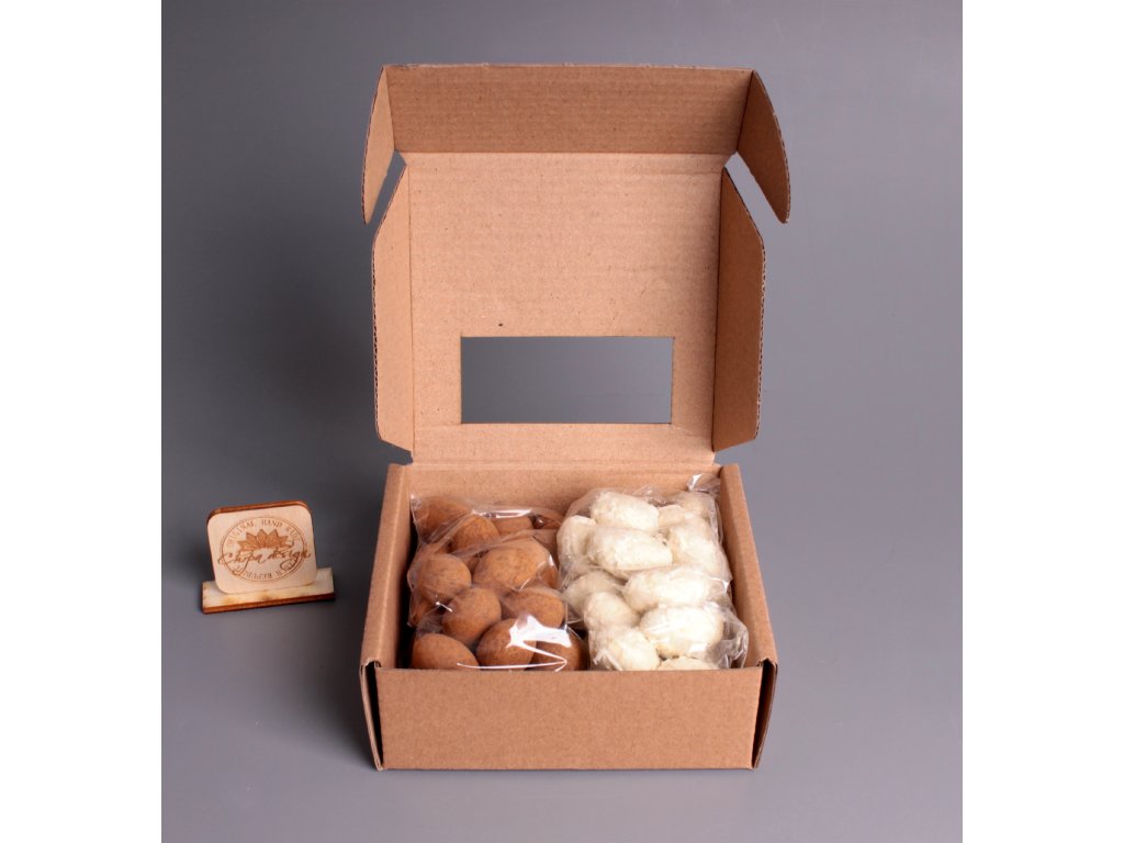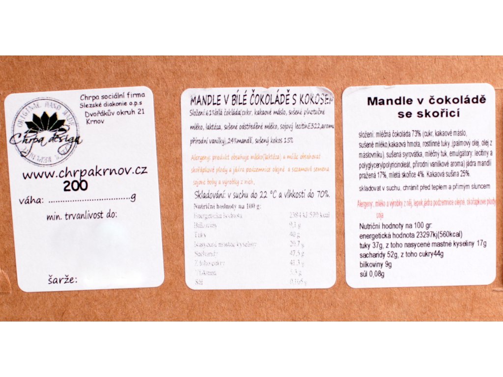 Mandle v bílé čokoládě s kokosem a mandle v čokoládě se skořicí.