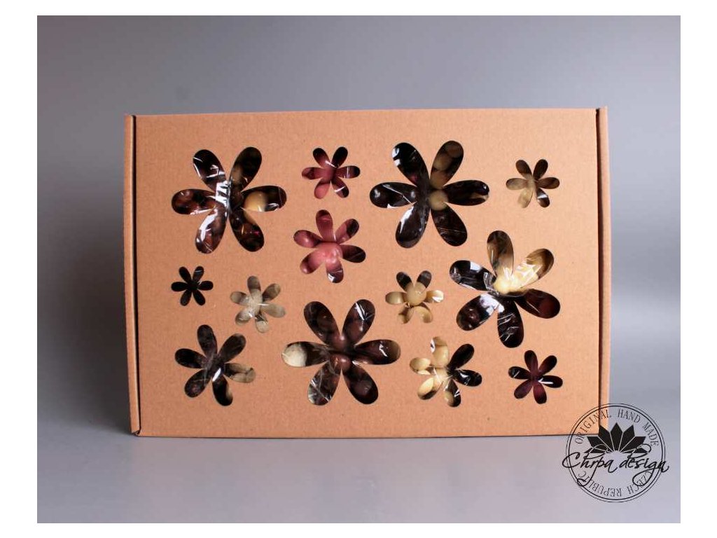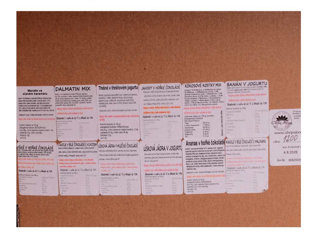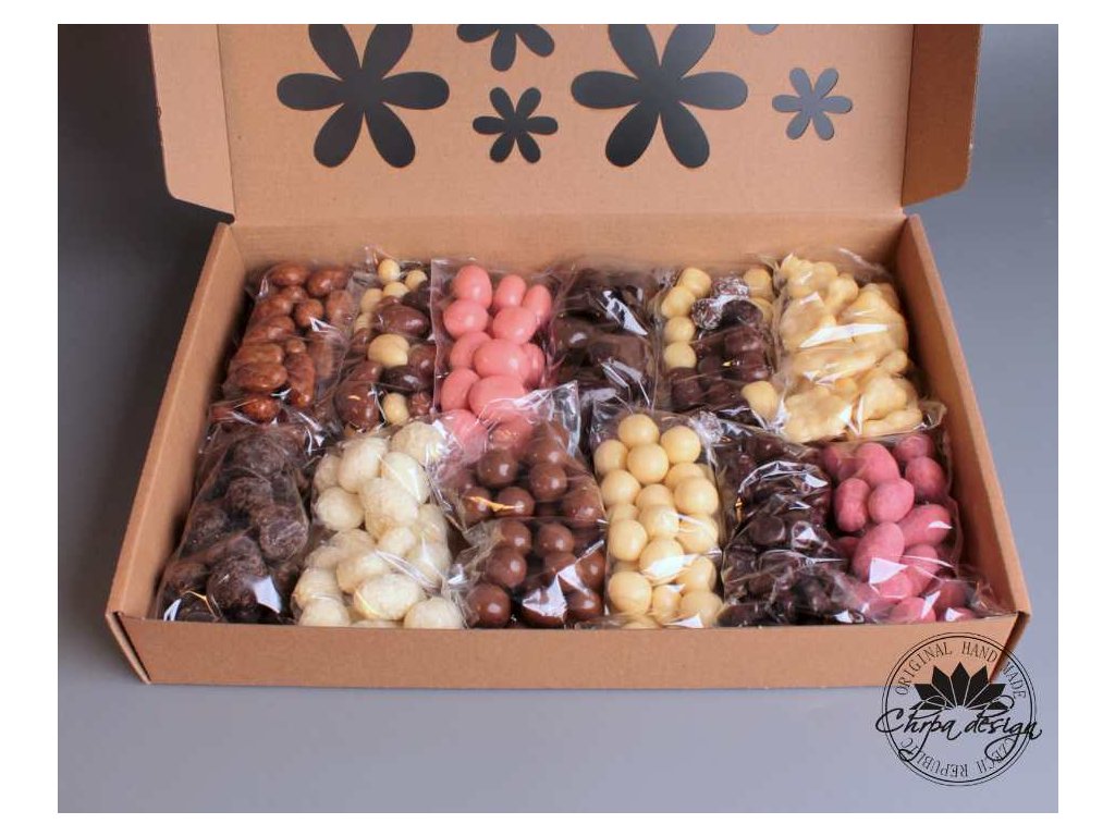 Mandle ve slaném karamelu, Dalmatin mix, Třešně v třešňovém jogurtu, Jahody v hořké čokoládě, Kokosové kostky mix, Banán v jogurtu, Višně v hořké čokoládě, Mandle v bílé čokoládě s kokosem, Lísková jádra v mléčné čokoládě, Lísková jádra v jogurtu, Ananas v hořké čokoládě, Mandle v bílé čokoládě s malinami.