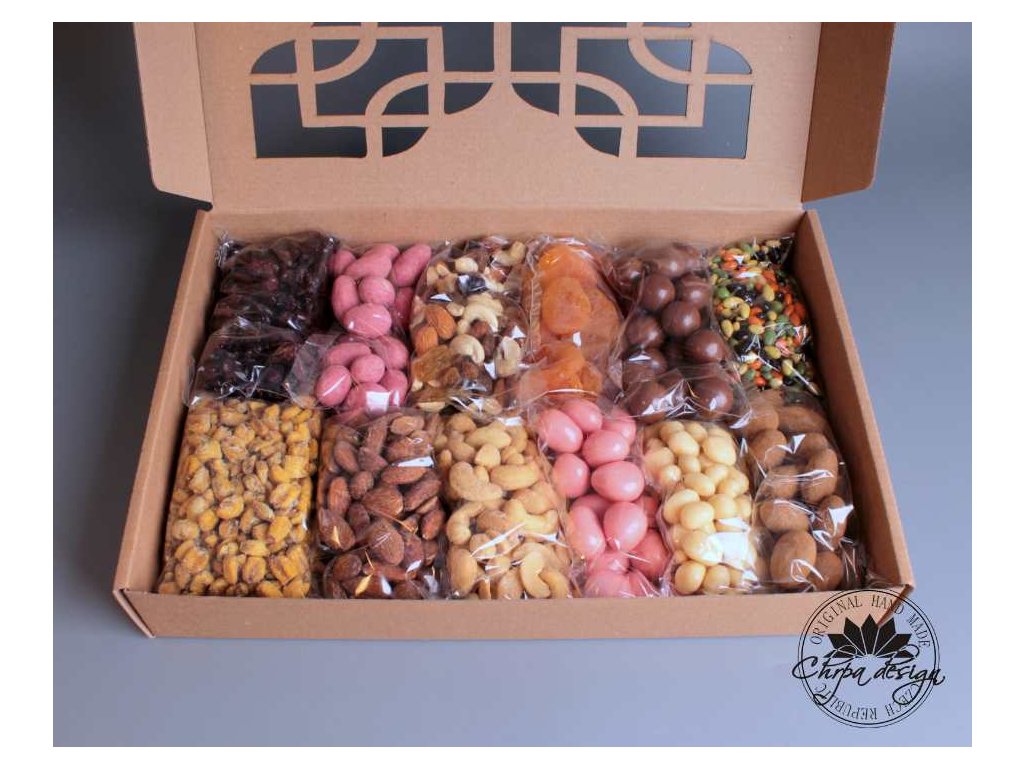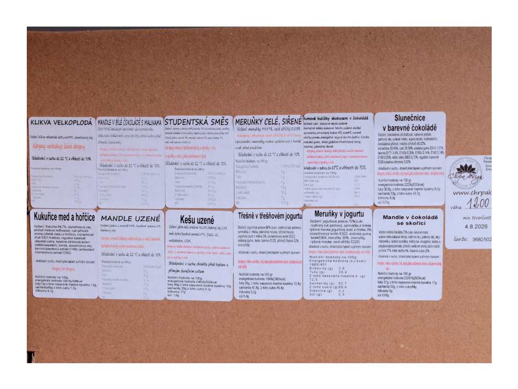 Klikva velkoplodá (brusinky), Mandle v bílé čokoládě s malinami, Studentská směs, Meruňky celé siřené, Rumové kuličky s kokosem v čokoládě, Slunečnice v čokoládě, Kukuřice med a hořčice, Mandle a kešu uzené, Třešně v třešňovém jogurtu, Meruňky v jogurtu, Mandle v čokoládě se skořicí.