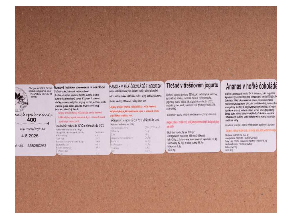 Rumové kuličky v čokoládě s kokosem, Mandle v bílé čokoládě s kokosem, Třešně v třešňovém jogurtu, Ananas v hořké čokoládě.
