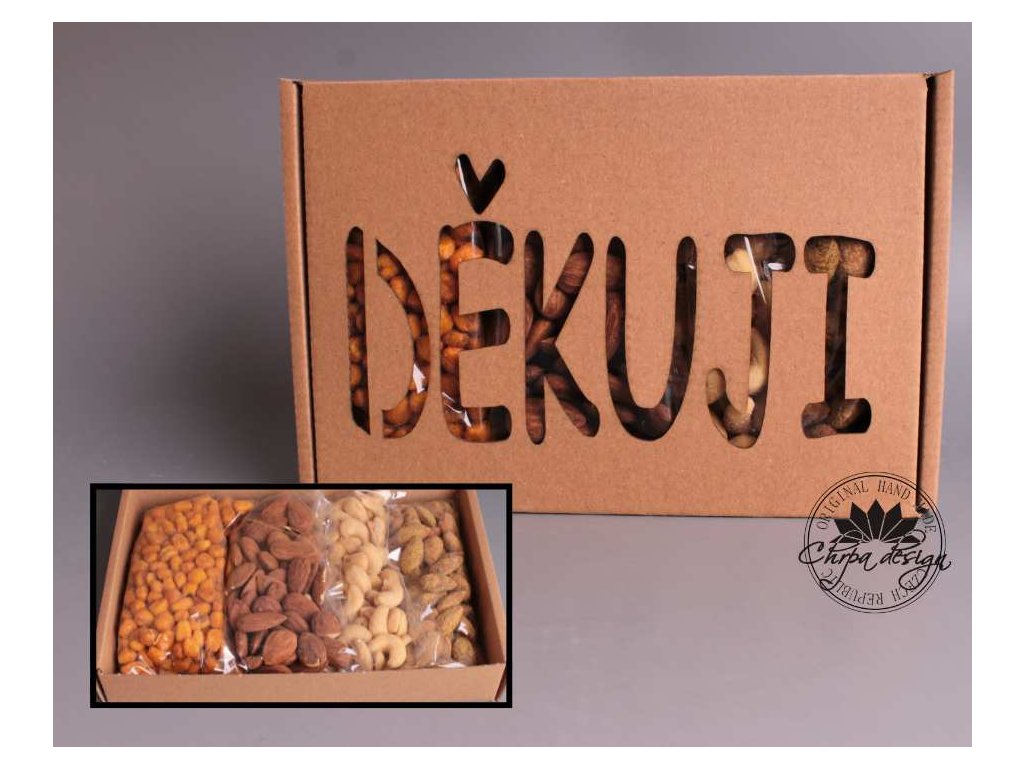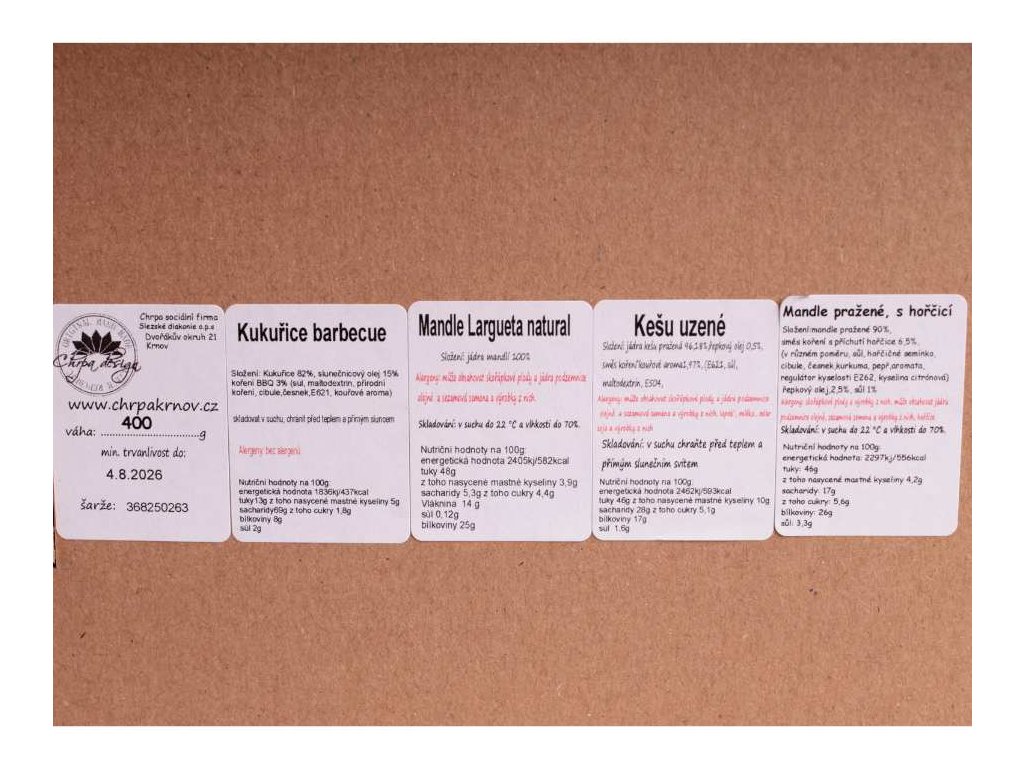 Kukuřice barbecue, Mandle Largueta natural, Kešu uzené, Mandle pražené s hořčicí.