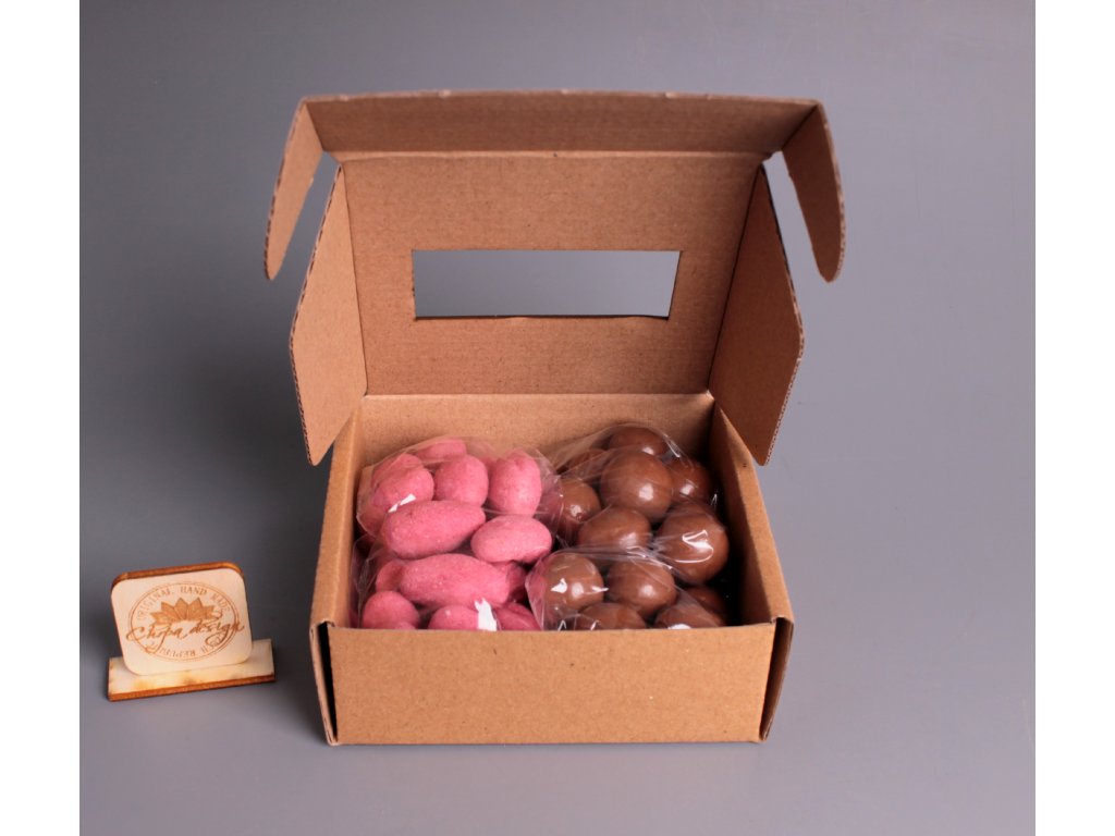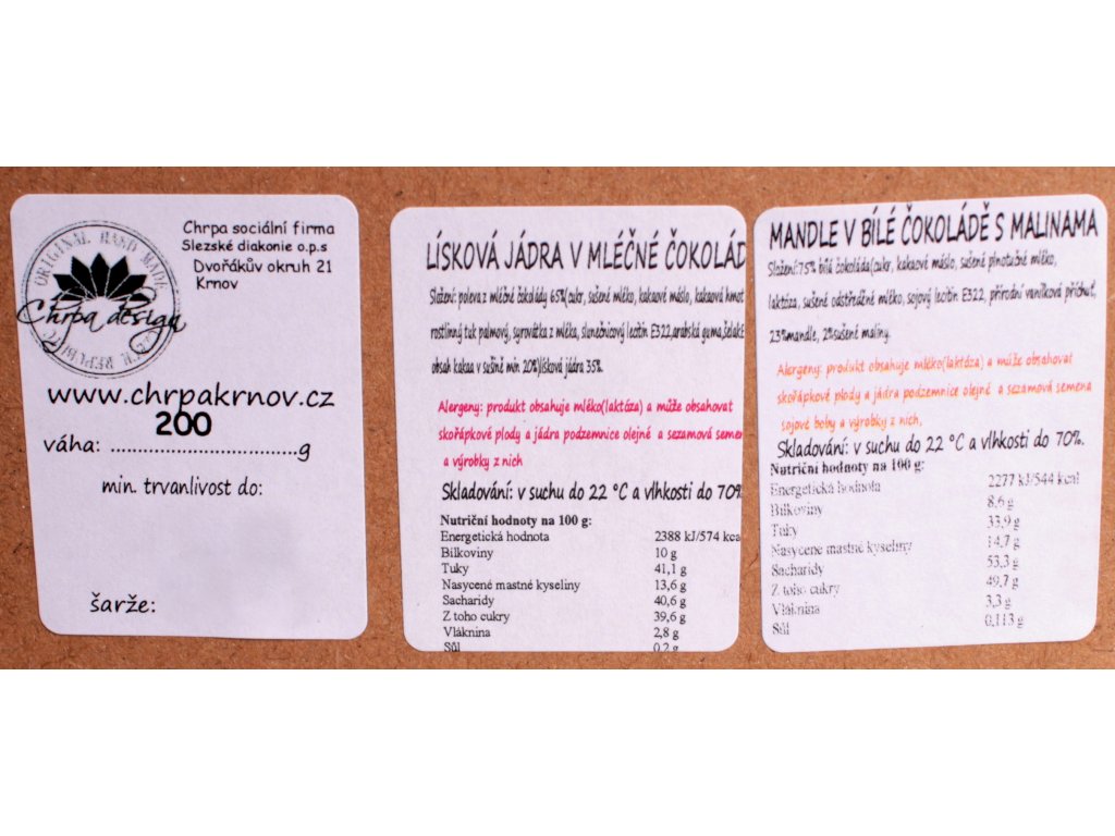 Mandle v bílé čokoládě s malinama a lísková jádra v mléčné čokoládě.