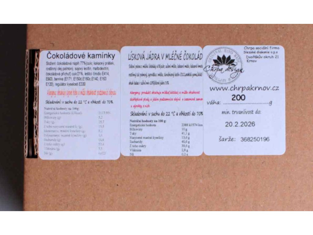 Čokoládové kamínky 100g a Lísková jádra v mléčné čokoládě 100g.