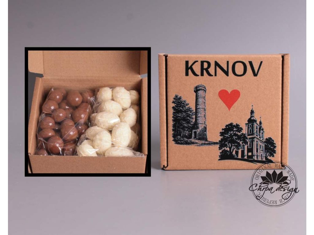 Krabička plná dobrot s Krnovským designem - potiskem na UV tiskárně.