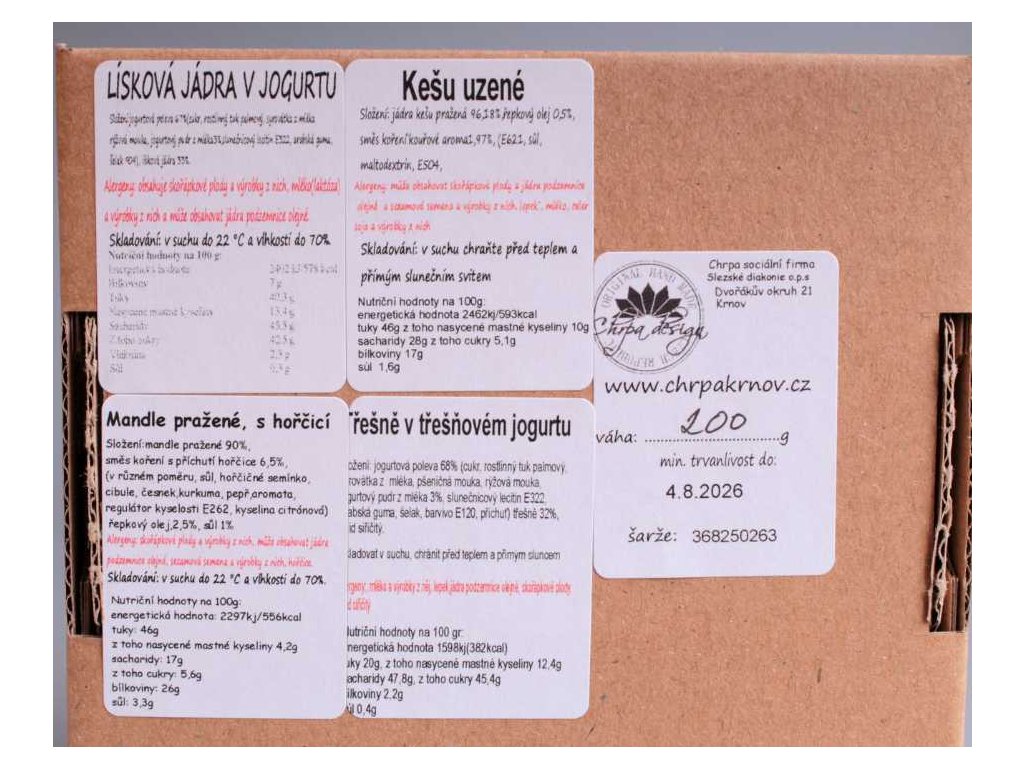 Mandle pražené s hořčicí 50g, Kešu uzené 50g, Lísková jádra v jogurtu 50g, Třešně v třešňovém jogurtu 50g.