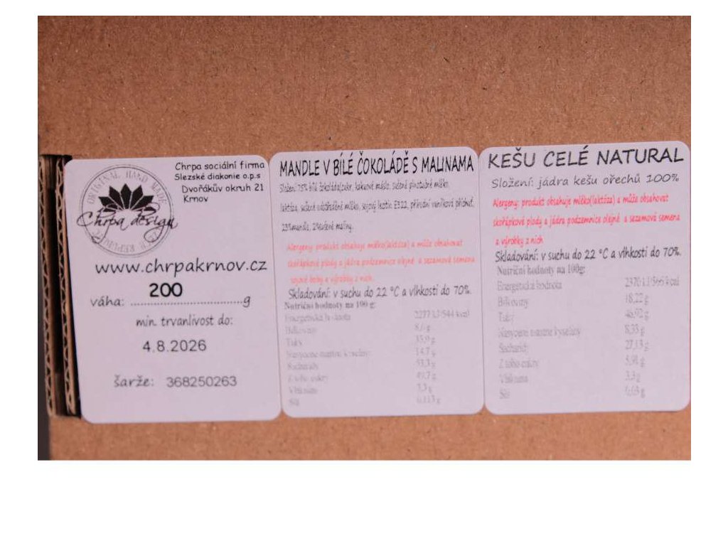 Mandle v bílé čokoládě s malinami 100g a Kešu celé natural 100g.