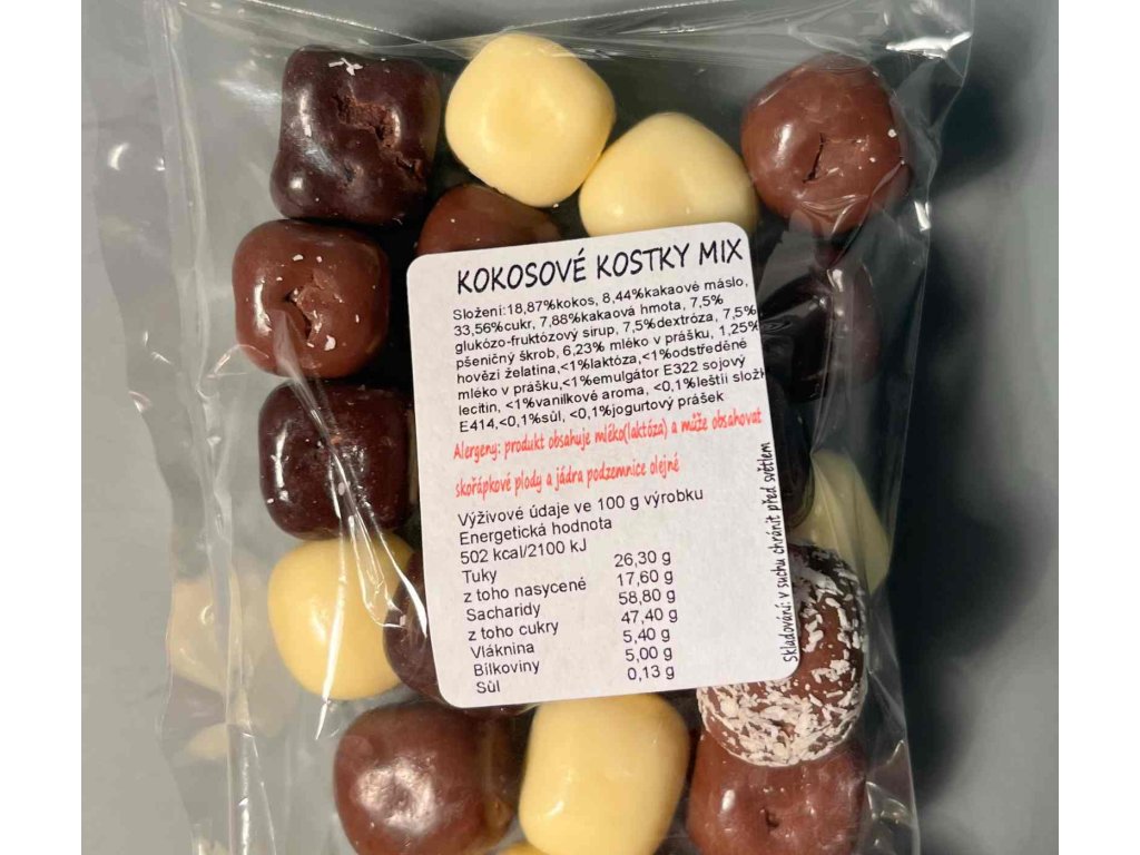 Hledáte nějakou dobrotu pro své milované? Tak pro Vás jsme připravili naše nové mlsné pytlíky - přebal vidíte na fotce a vybrat si můžete z 5 druhů oříšků nebo suš. ovoce (na výběr máme - kešu natural, mandle v bílé čokoládě s malinami, mandle v bílé čokoládě a kokosu, uzené mandle, kokosové kostky).