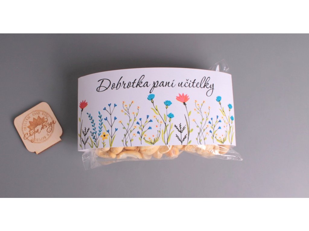 Hledáte nějakou dobrotu ke konci školního roku? Tak pro Vás jsme připravili naše nové mlsné pytlíky - přebal vidíte na fotce a vybrat si můžete z 6 druhů oříšků nebo suš. ovoce (na výběr máme - kešu natural, mandle v bílé čokoládě s malinami, mandle v bílé čokoládě a kokosu, uzené mandle, višně v hořké čokoládě a mandle v mléčné čokoládě se skořicí).