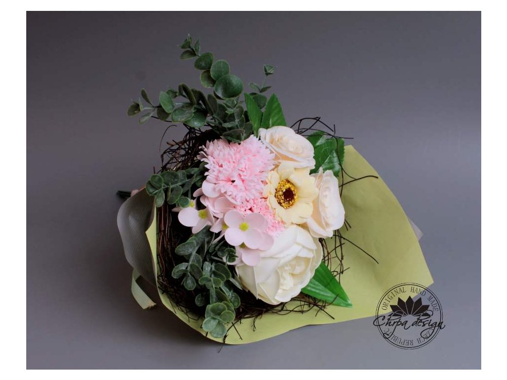 Mýdlové jsou pouze okvětní lístky, zbytek pugetu jsou dekorace.