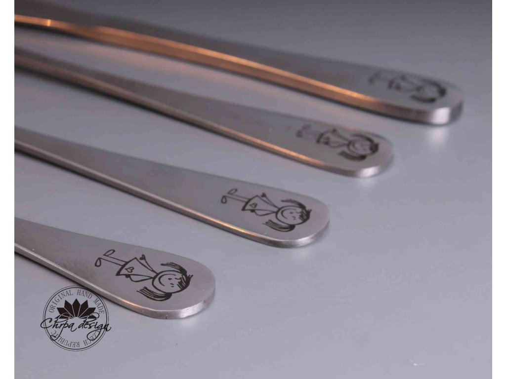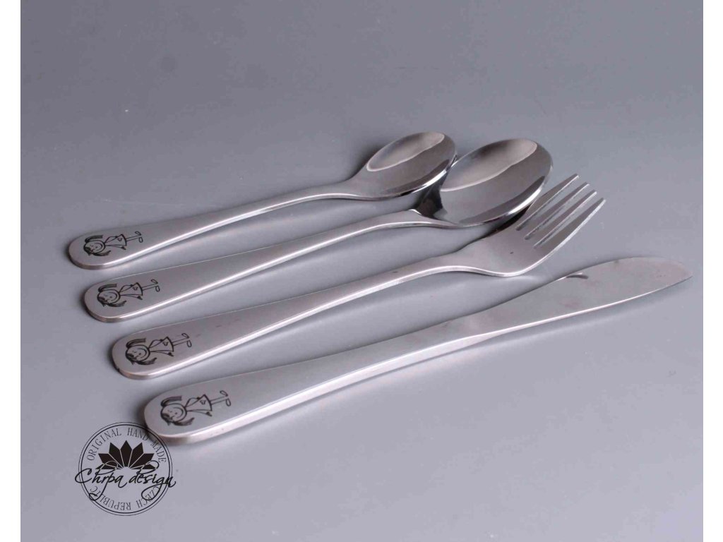 Praktický a roztomilý příbor pro děti, obsahující lžičku, vidličku, nůž a malou lžičku. Na rukojetích je jemný gravírovaný motiv holčičky, který si děti okamžitě oblíbí.
