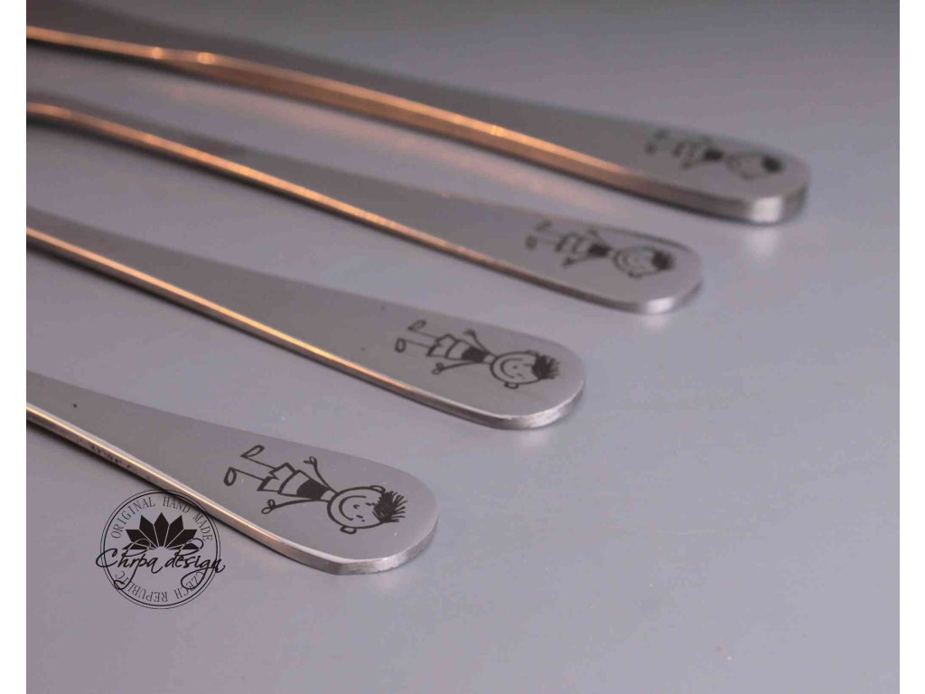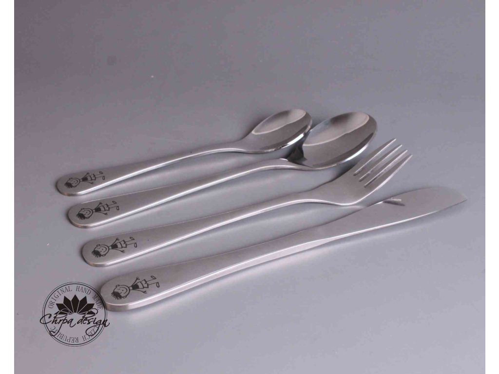 Praktický a roztomilý příbor pro děti, obsahující lžičku, vidličku, nůž a malou lžičku. Na rukojetích je jemný gravírovaný motiv kluka, který si děti okamžitě oblíbí.