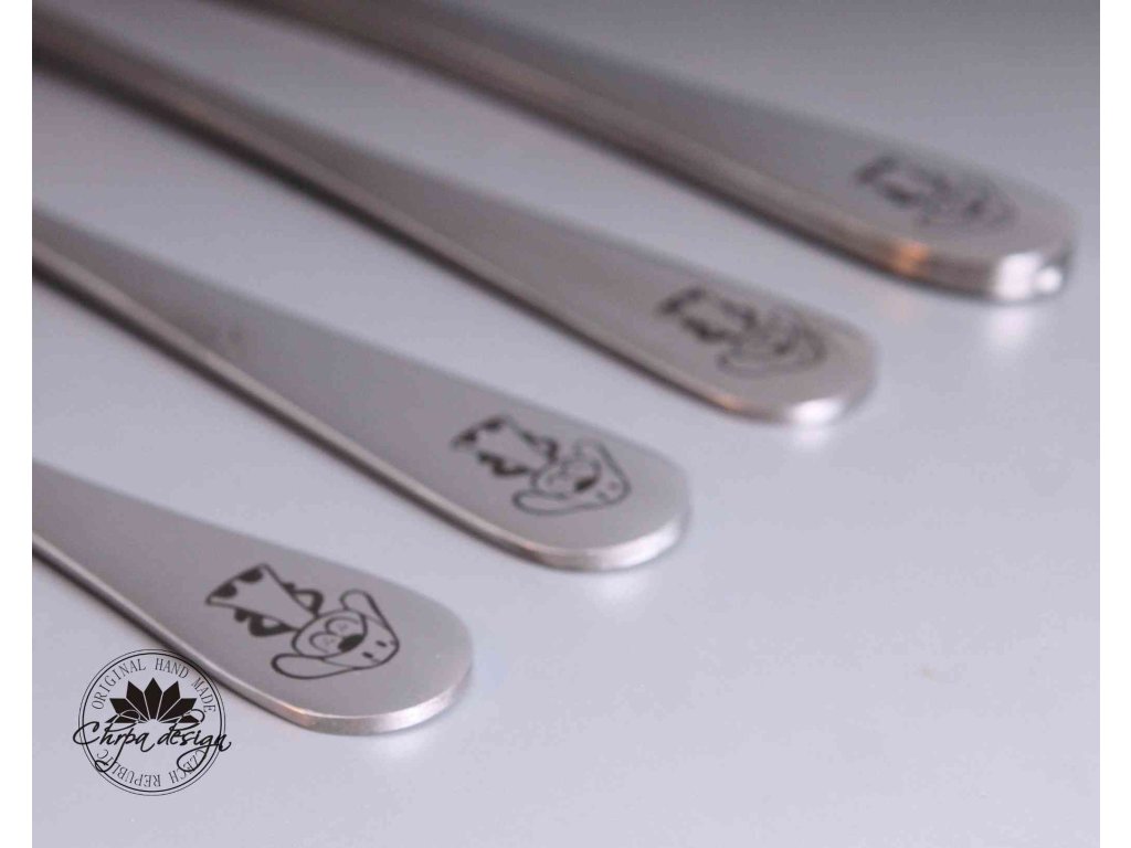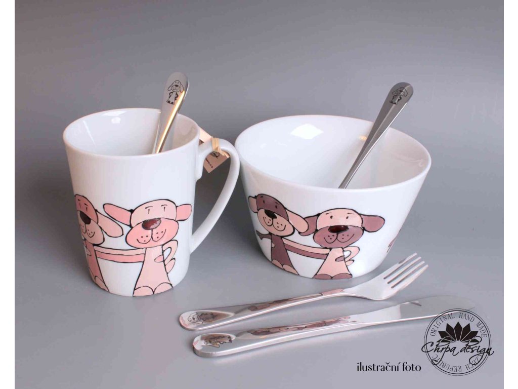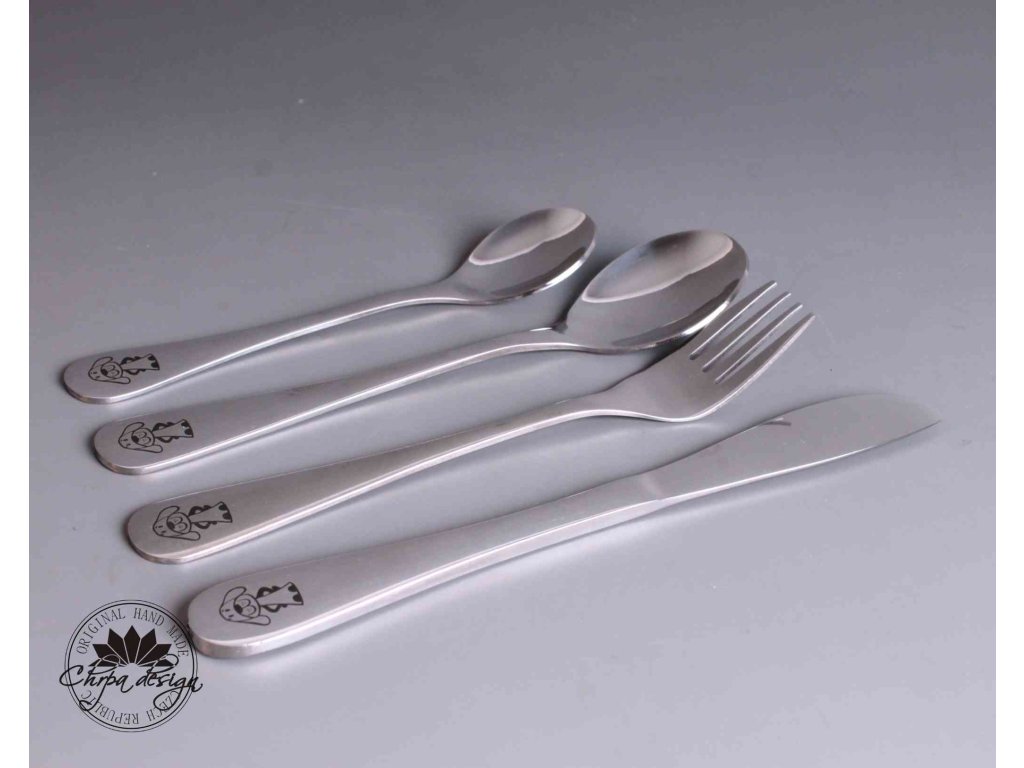 Praktický a roztomilý příbor pro děti, obsahující lžičku, vidličku, nůž a malou lžičku. Na rukojetích je jemný gravírovaný motiv pejska, který si děti okamžitě oblíbí.