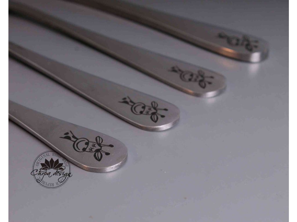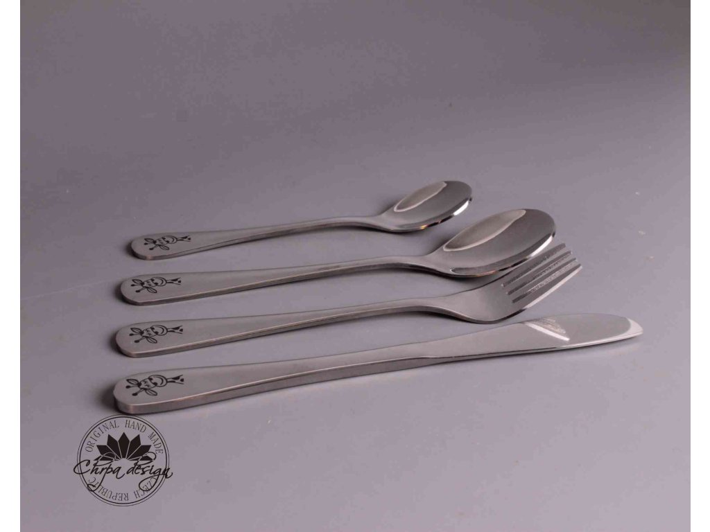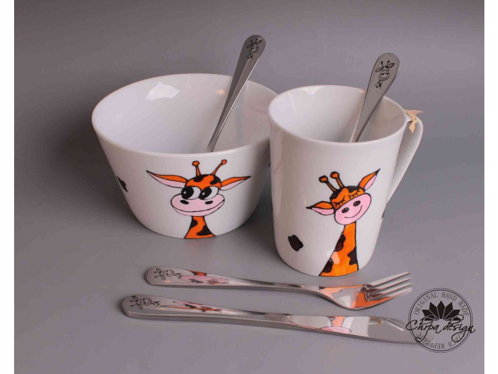 Praktický a roztomilý příbor pro děti, obsahující lžičku, vidličku, nůž a malou lžičku. Na rukojetích je jemný gravírovaný motiv žirafky, který si děti okamžitě oblíbí.