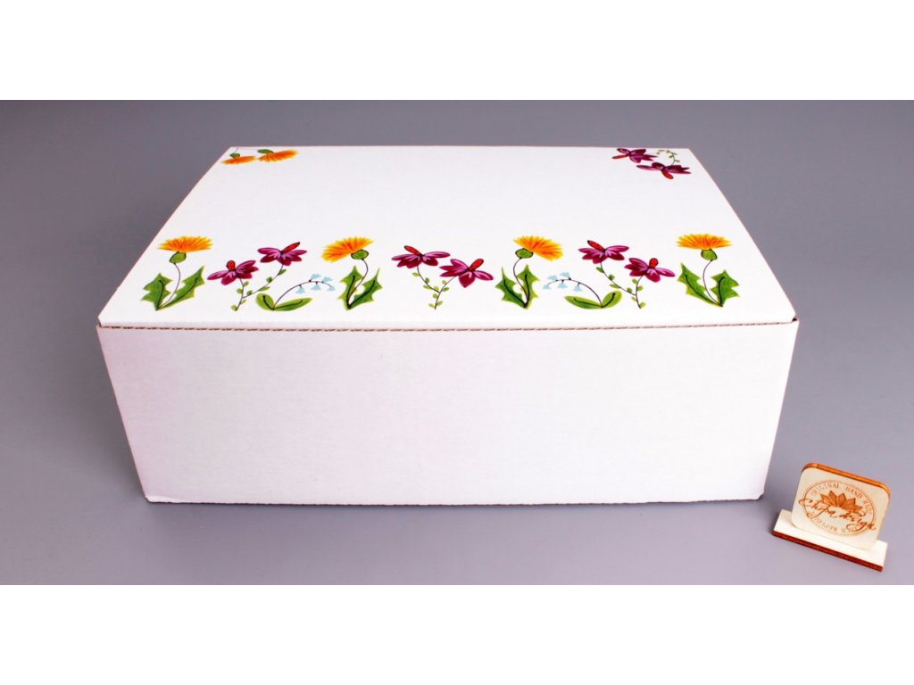Papírová dárková krabice je z venkovní strany bílá a uvnitř hnědá.