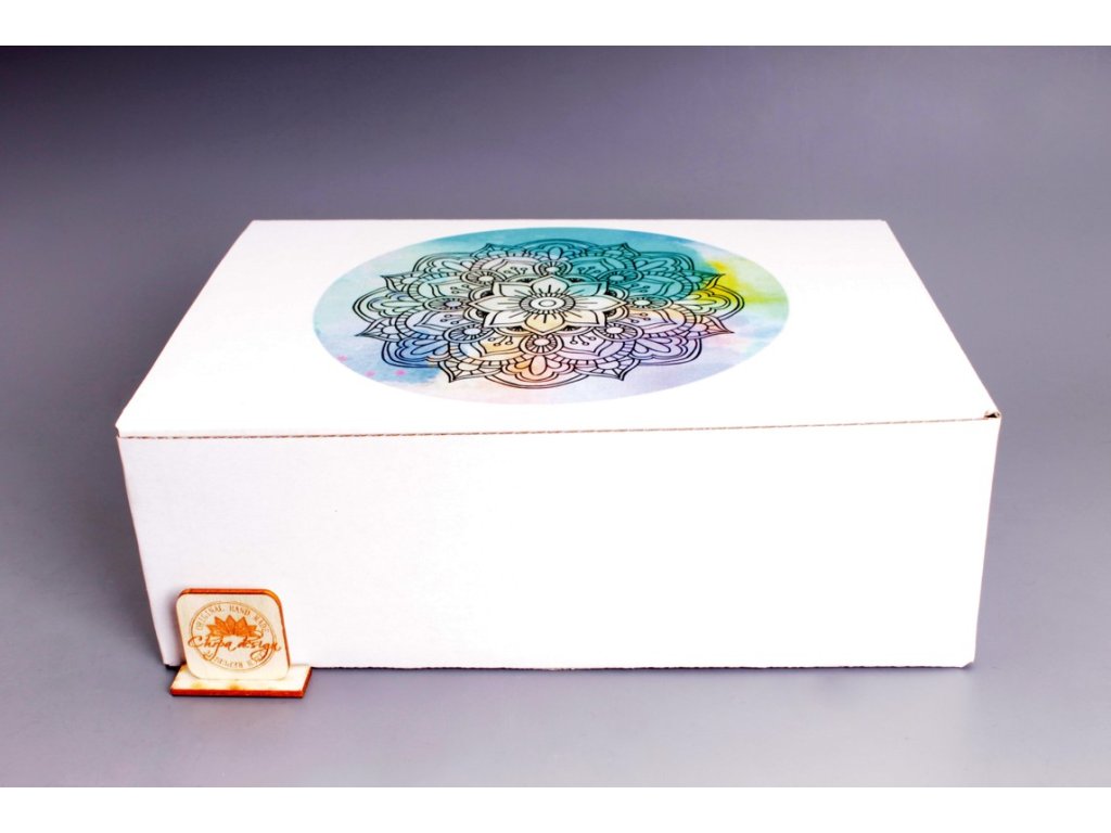 Papírová dárková krabice je z venkovní strany bílá a uvnitř hnědá.
