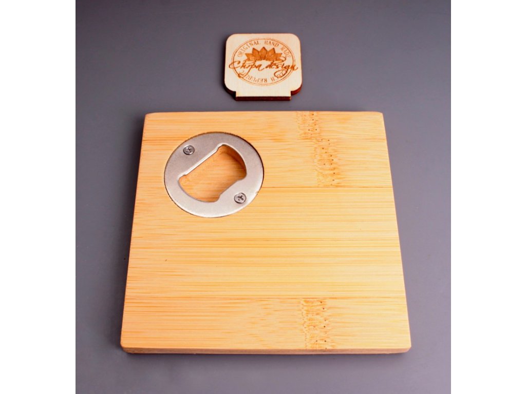 Dřevěný podtácek (rozměr 10x10cm) potištěný metodou UV tisku, který je multifunkční a můžete jej použít i jako otvírák.