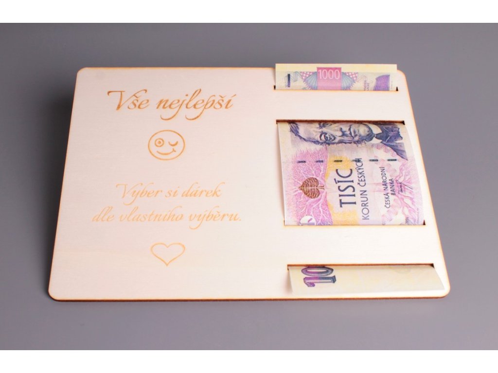 Darovat někomu peníze není nic špatného. Ale když už, tak originálně. Rozměr je 20 x 15 cm. Bankovku stačí protáhnout otvory a je to. Drží pevně a vejde se tam i více bankovek.