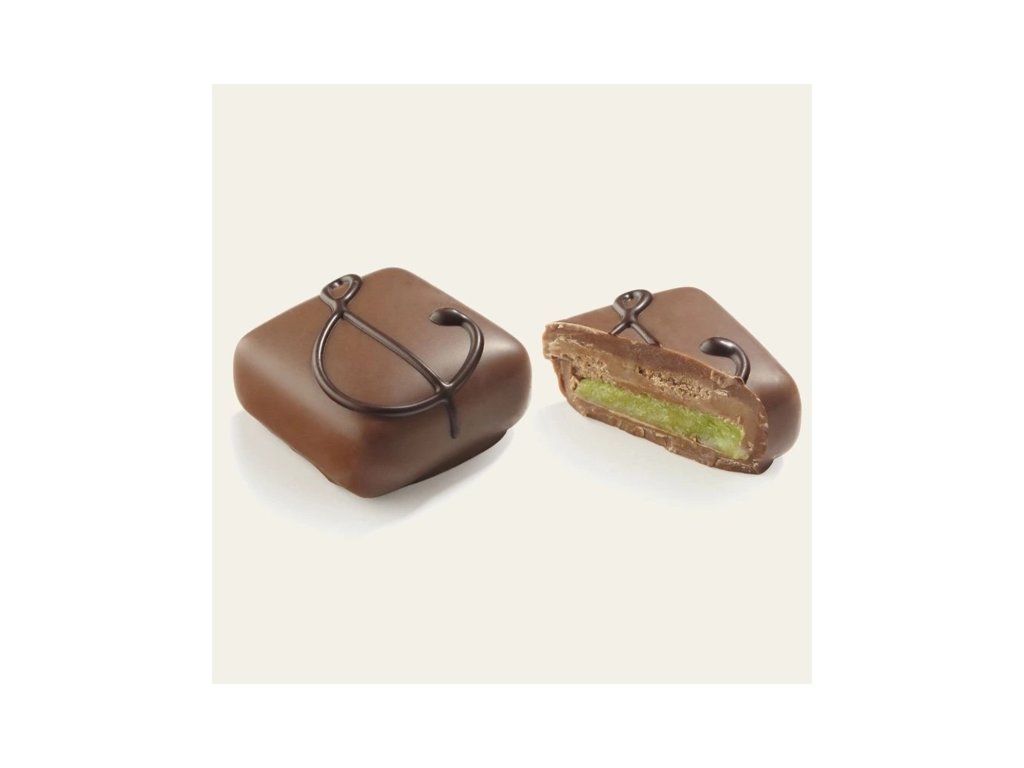 Tato pralinka má příchuť: Pistáciový marcipán s lísko-oříškovým krémem