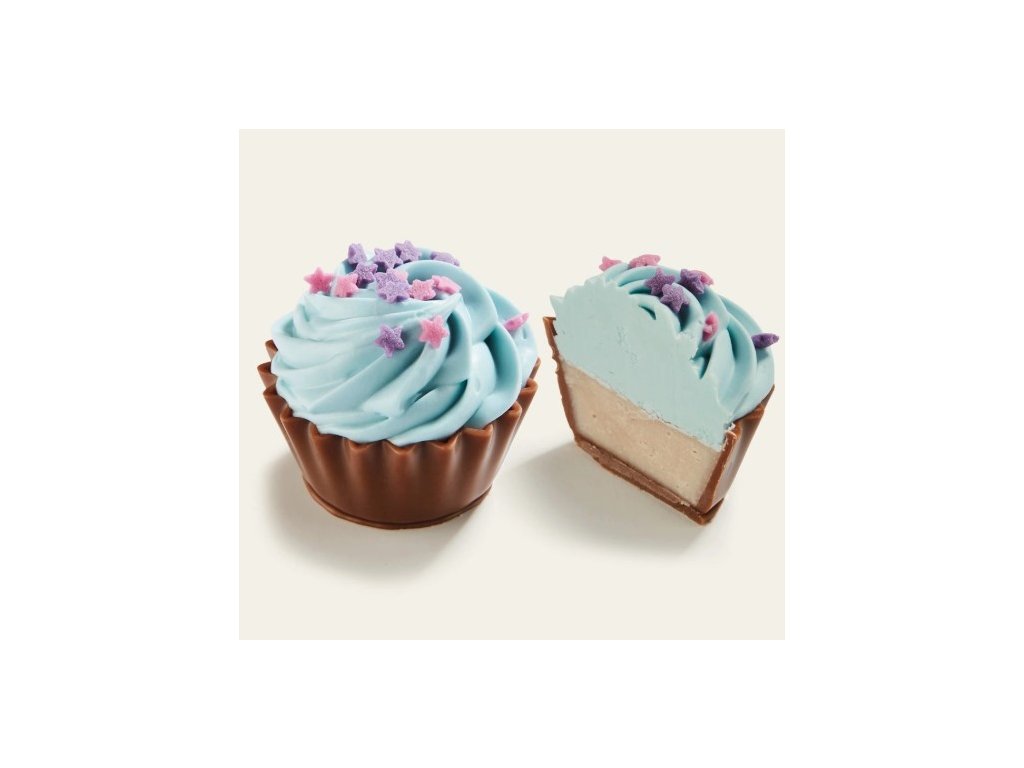 Tato pralinka má příchuť: Bílá ganache s borůvkovou příchutí a krémem z modré čokolády.