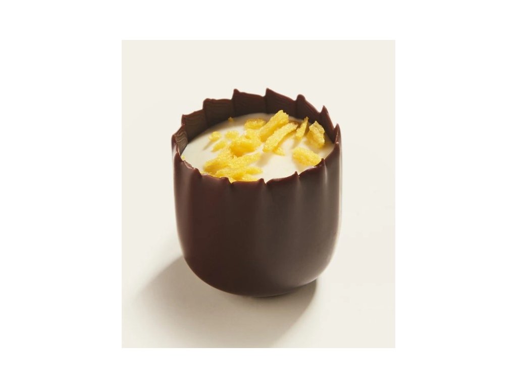 Tato pralinka z hořké čokolády má náplň z broskvové ganache s glazé z nealko šampaňského.