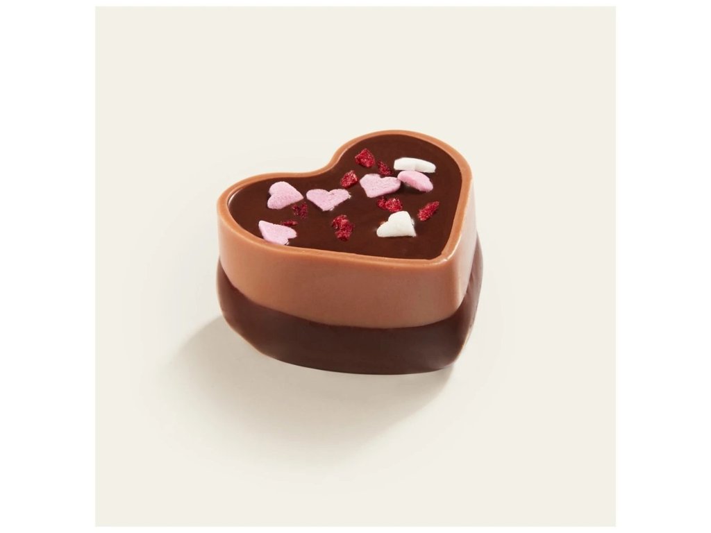 Tato pralinka má příchuť: Tmavá čokoládová pěna dozdobená srdíčky