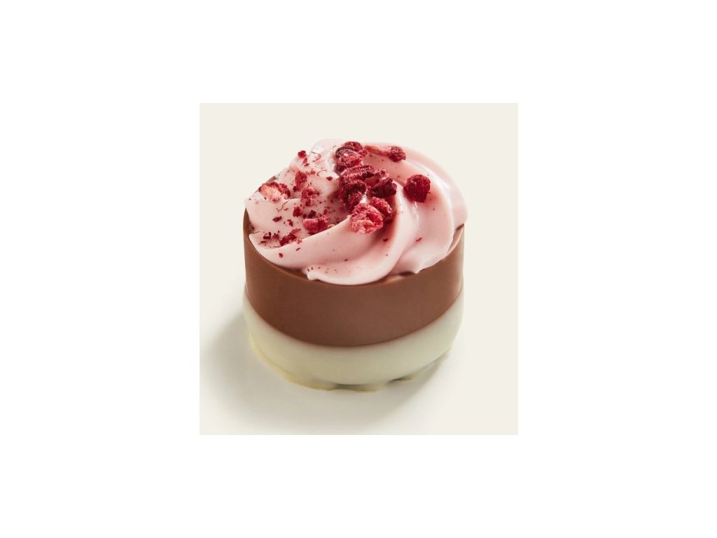 Pralinka z mléčné a bílé čokolády s náplní z bílé malinové ganache s kousky malin v růžovém čokoládovém krému.