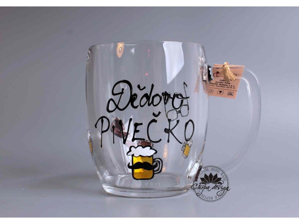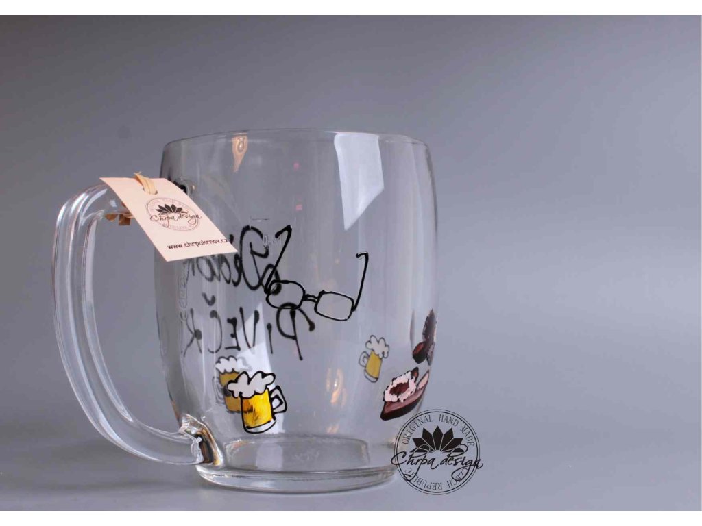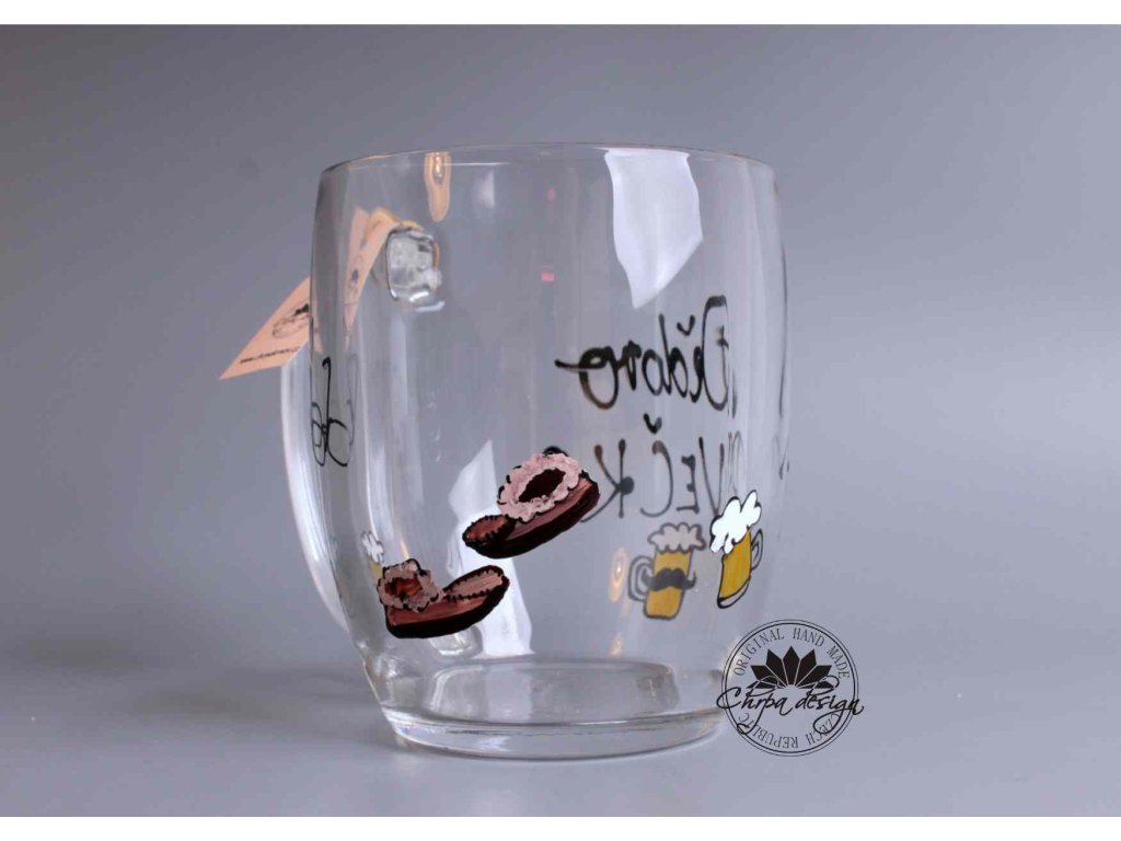 Skleněný ručně malovaný půllitr o obsahu 0,5 L. Půllitr se dá používat a mýt běžným způsobem. Nedoporučujeme mytí v myčce.