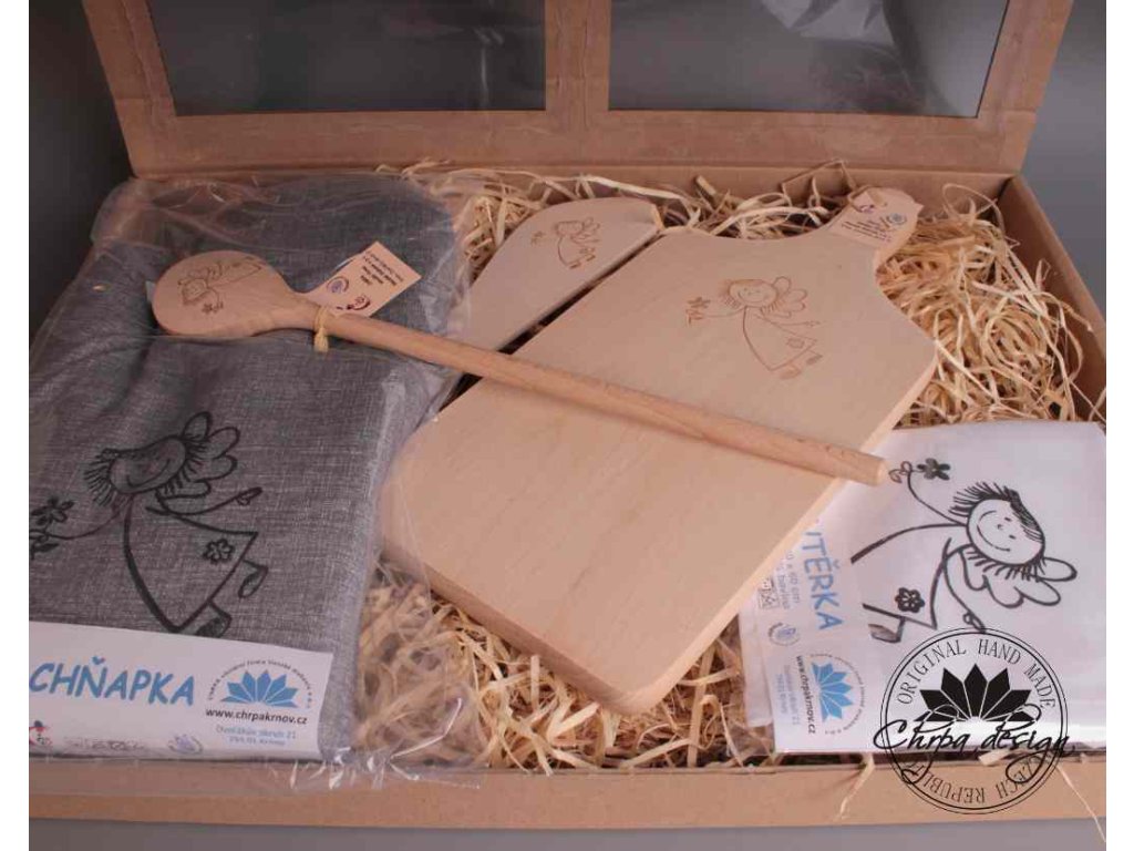 Dárková sada pro někoho, kdo rád vaří. Sada obsahuje prkénko, vařečku, obracečku, utěrku, chňapku. Textilní věci jsou vyrobeny z bavlněné látky a ruční tisk obrázku. Textil můžete prát na 40 stupňů. Dřevěné výrobky mají obrázek vypálený laserem. Určeno pro běžné použití.
