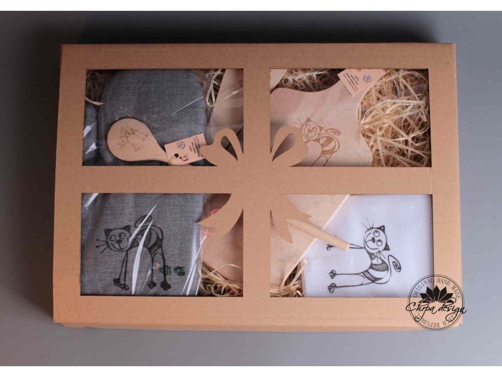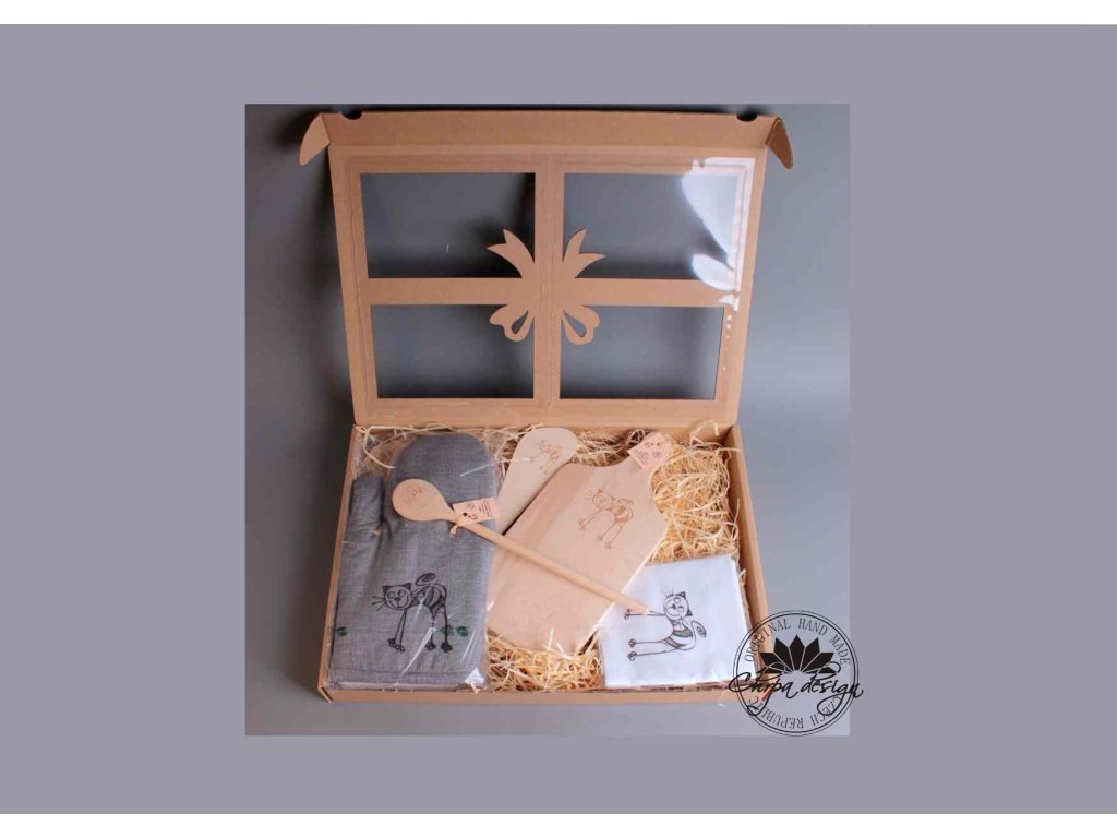 Dárková sada pro někoho, kdo rád vaří. Sada obsahuje prkénko, vařečku, obracečku, utěrku, chňapku. Textilní věci jsou vyrobeny z bavlněné látky a ruční tisk obrázku. Textil můžete prát na 40 stupňů. Dřevěné výrobky mají obrázek vypálený laserem. Určeno pro běžné použití.
