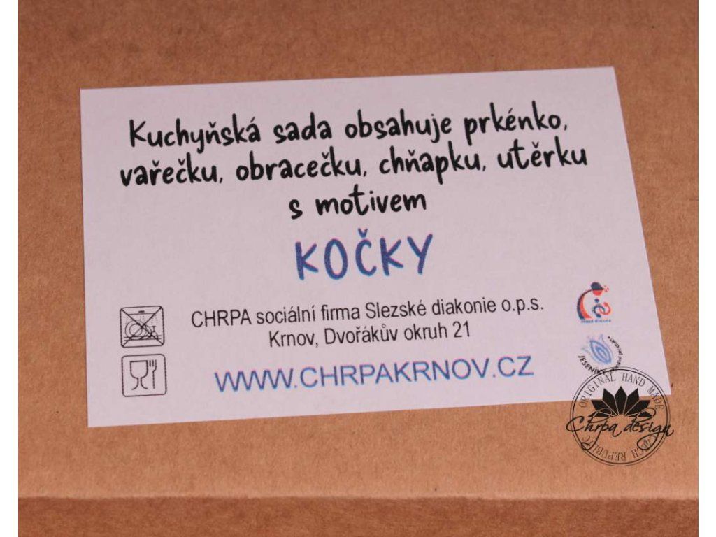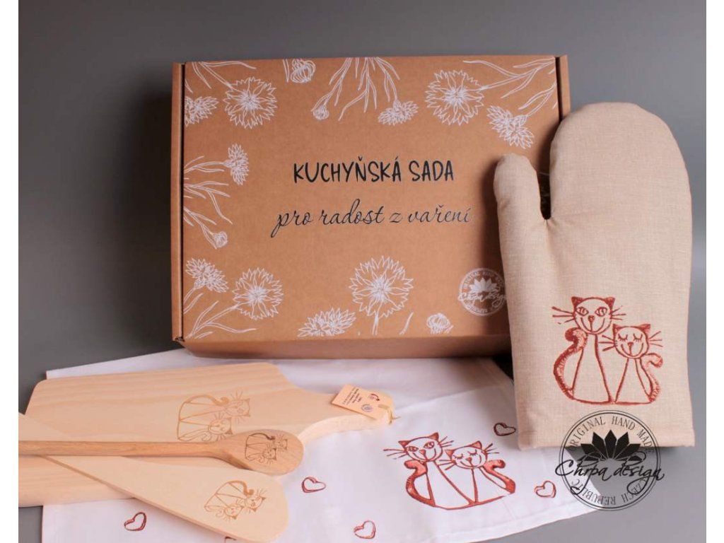 Dárková sada pro někoho, kdo rád vaří. Sada obsahuje prkénko, vařečku, obracečku, utěrku, chňapku. Textilní věci jsou vyrobeny z bavlněné látky a ruční tisk obrázku. Textil můžete prát na 40 stupňů. Dřevěné výrobky mají obrázek vypálený laserem. Určeno pro běžné použití.