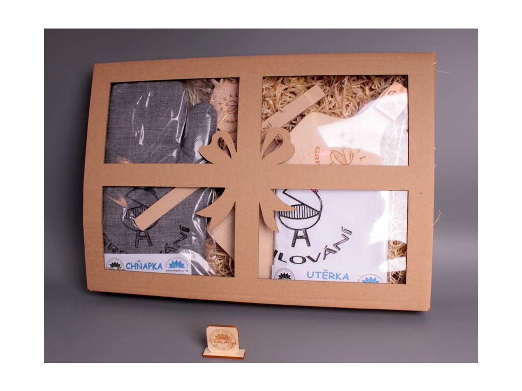 Dárková sada pro někoho, kdo rád vaří a griluje.  Sada obsahuje prkénko, dřevěné kleště, obracečku, utěrku, chňapku. Textilní věci jsou vyrobeny z bavlněné látky a ruční tisk obrázku. Textil můžete prát na 40 stupňů. Dřevěné výrobky mají obrázek vypálený laserem. Určeno pro běžné použití.